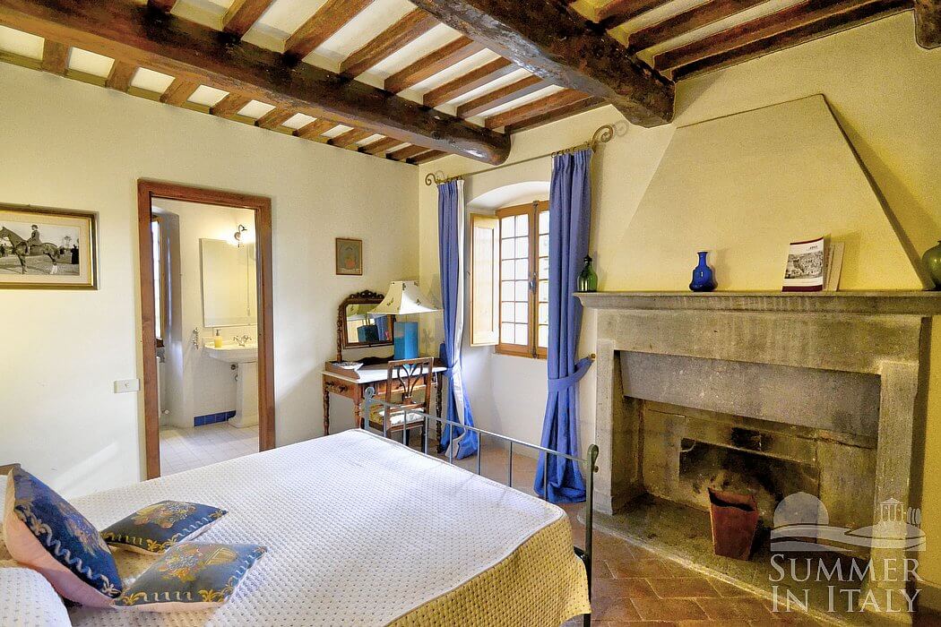 You will be able to enter the fifth bedroom through a corridor. The bedroom has a matrimonial bed (160 cm/63 inches, wider than a queen-size bed). There is an age-old fireplace, for decorative purposes only. The furnishings include a desk. The room has a window. This bedroom has an en-suite bathroom, equipped with a washbasin, a toilet, a fully enclosed shower and a hairdryer.