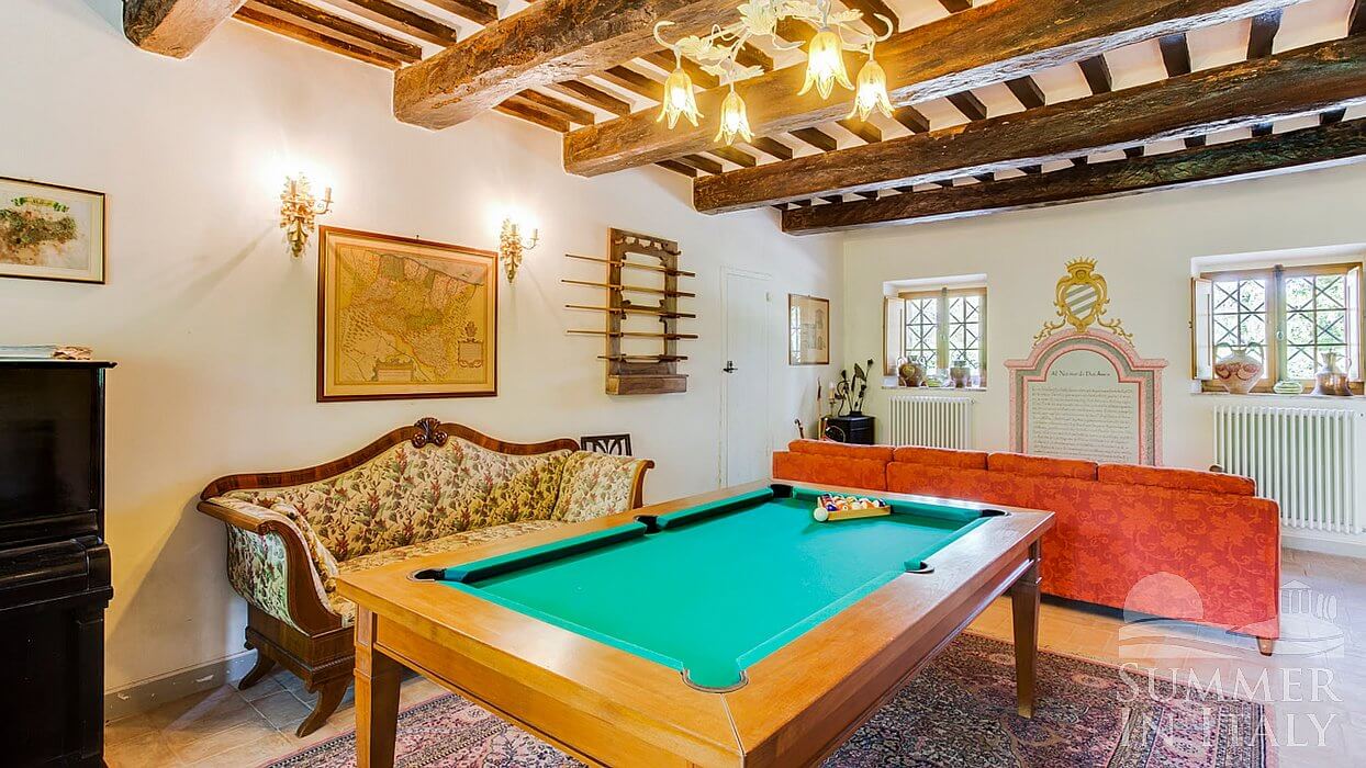 The furnishings of the living room are classic and welcoming, and include a sofa and armchairs. In this room you will find an upright piano. Here you will find a pool table and a game table. From the living room you will be able to enter the garden through a French door. The room also has three windows.