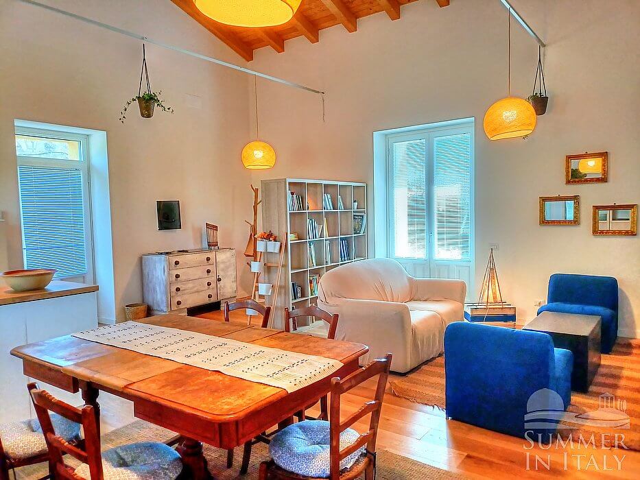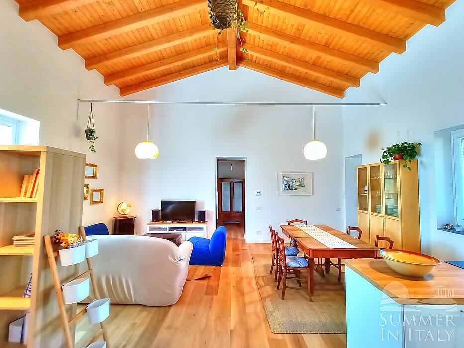 You will be able to enter the third living room from the garden through an external access. The floor is paved with wood. The ceiling is sloped and is made of wood. The furnishings are simple and comfortable, and include a sofa and two armchairs. In the living room you will also find a cooking area. The kitchenette is equipped with a four-burner induction cooker, an electric oven, a refrigerator with freezer, a dishwasher, an Italian-style coffee-maker, a toaster and a kettle. The dining table can accommodate five guests. In this room you will find a television (local channels). From the living room you will be able to enter the patio and the garden through two French doors. The room also has two windows.