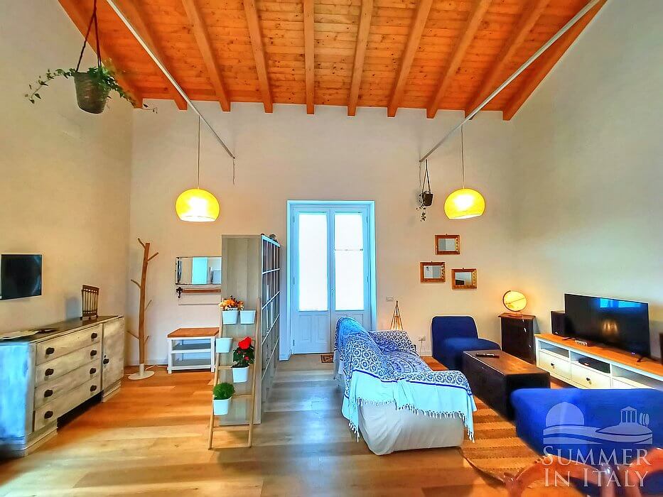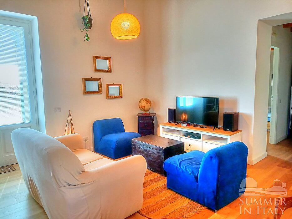 The first living room is paved with terracotta tiles. The ceiling is vaulted. The furnishings are simple and comfortable, and include three armchairs. In this room you will find a television (local channels). From the living room you will be able to enter the alleyway in front of the house through a French door.
