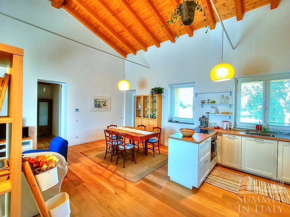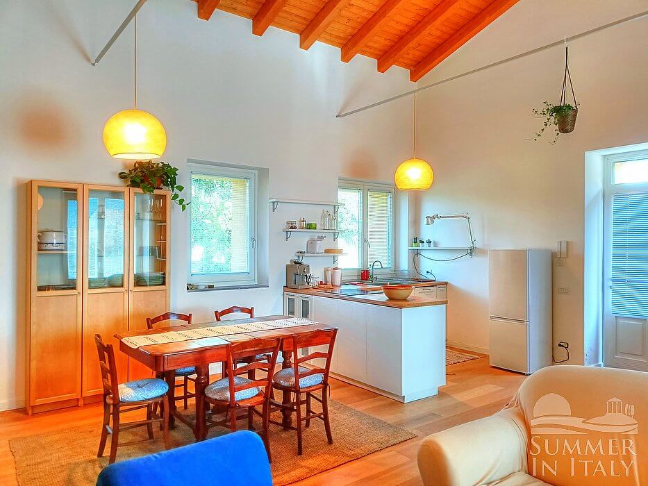 You will be able to enter the kitchen from the dining room. It is equipped with a four-burner electric cooker, a refrigerator with freezer, a microwave oven, an Italian-style coffee-maker and an American-style coffee-maker. Here you will also find an iron and an ironing board. The dining table can accommodate two guests. From the kitchen a French door will take you to the garden.