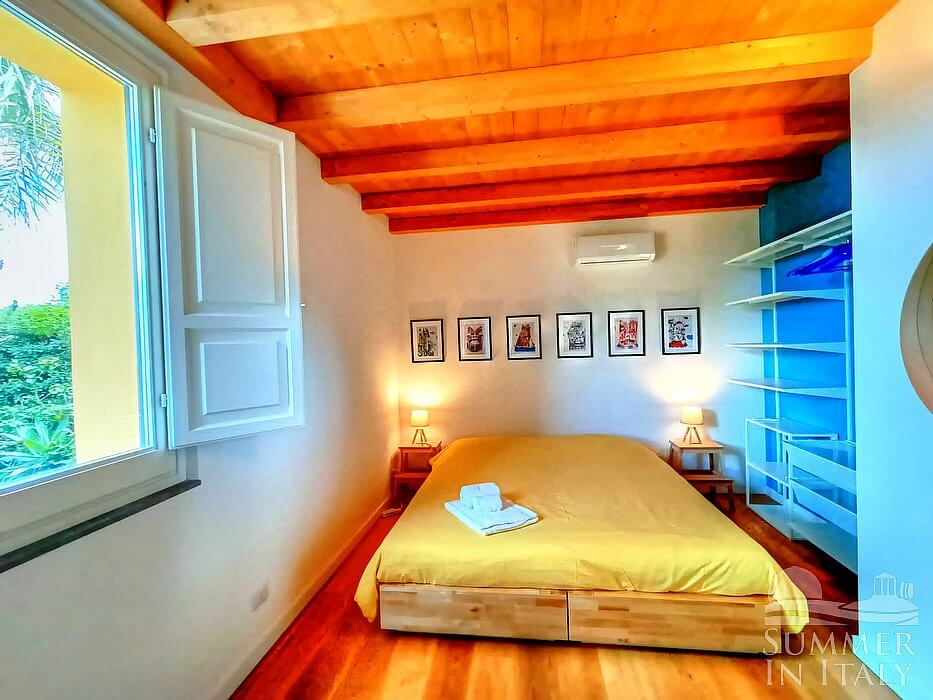 You will be able to enter the fifth bedroom from the fourth bedroom through an access area. The bedroom has a matrimonial bed (160 cm/63 inches, wider than a queen-size bed). From the bedroom you will be able to enter a long terrace with a view of the Mount Etna and of the sea at a distance through two French doors. The bedroom is equipped with an air conditioning/heating unit.
