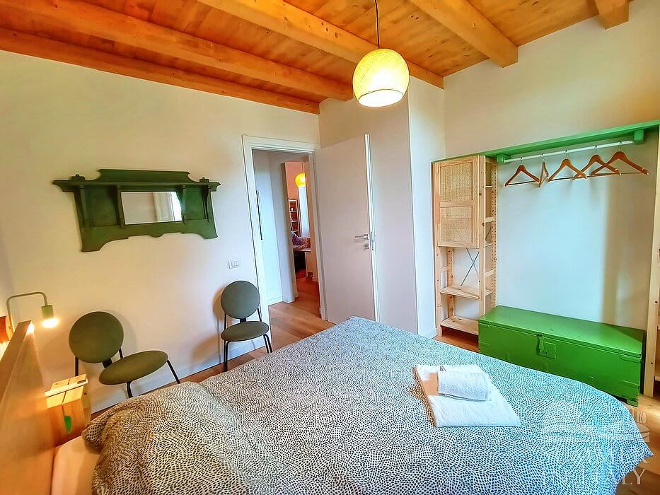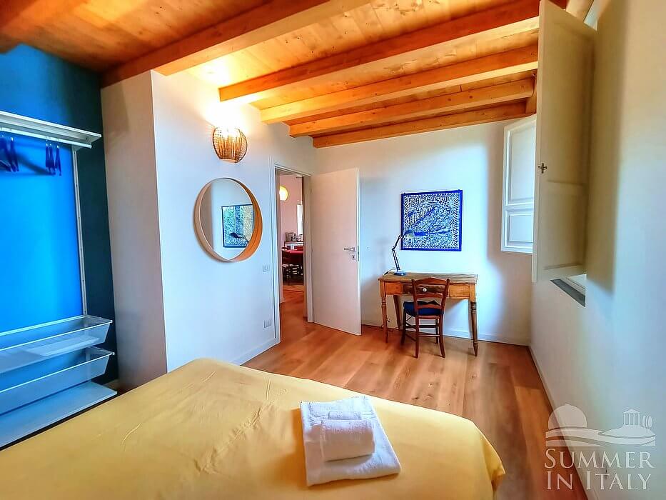 You will be able to enter the ninth bedroom from the living room through an access area. The bedroom has a matrimonial bed (160 cm/63 inches, wider than a queen-size bed), that can be split into twins if requested (please contact our staff in advance to make arrangements). The furnishings include a desk. The room has a window, and it's equipped with an air conditioning/heating unit.