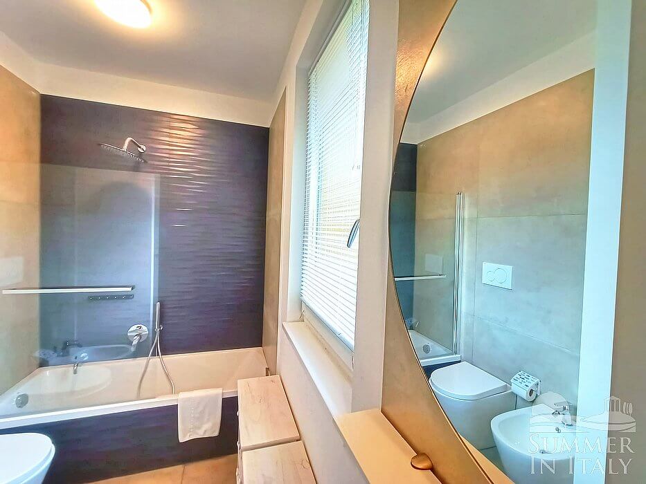 You will be able to enter the seventh bedroom through a corridor. The bedroom has a matrimonial bed (160 cm/63 inches, wider than a queen-size bed) and a single bed (80 cm/32 inches). In this room you will find a television (local channels). From the bedroom you will be able to enter a small balcony through a French door. The bedroom is equipped with an air conditioning/heating unit. This bedroom has an en-suite bathroom, decorated with majolica tiles and equipped with a washbasin, a toilet, a fully enclosed shower and a hairdryer.