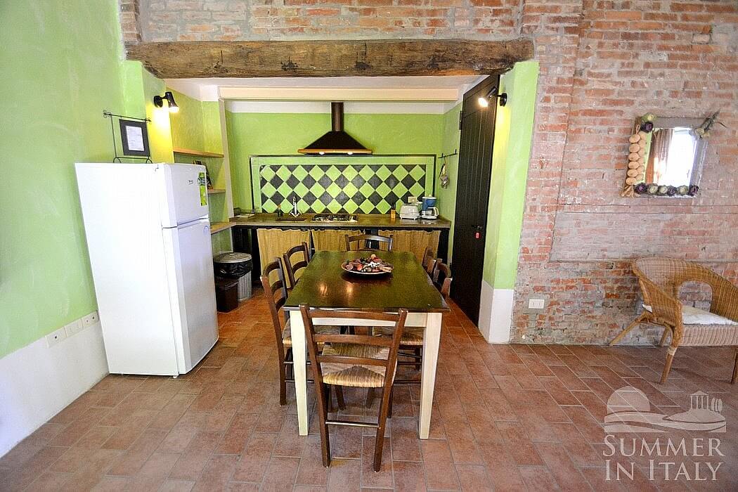 You will be able to enter the family room from the garden. In the family room you will also find a cooking area. The kitchenette is equipped with a four-burner gas cooker, an electric oven, a refrigerator with freezer and an Italian-style coffee-maker. The two dining tables can accommodate 16 guests. From the family room you will be able to enter the garden through a French door. The room also has three windows with a view of the greenery.