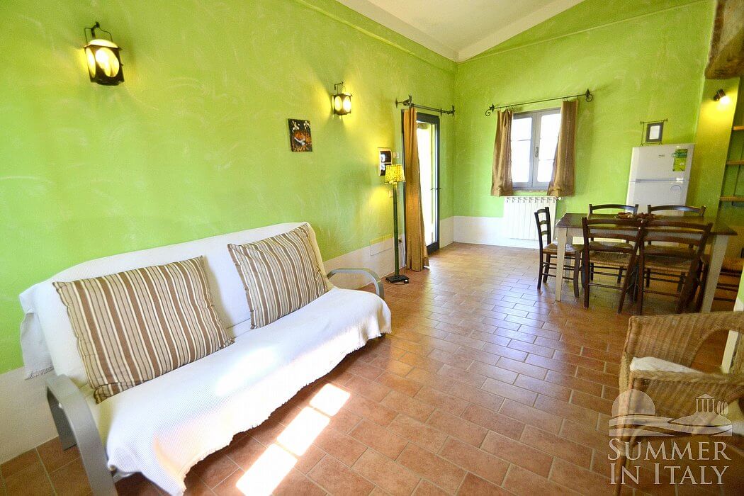 The living room is paved with terracotta tiles. The furnishings are simple and comfortable, and include a divan that unfolds into a double bed. In the living room you will also find a cooking area. The kitchenette is equipped with a four-burner gas cooker, a refrigerator with freezer, an Italian-style coffee-maker and a kettle. The dining table can accommodate four guests. From the living room you will be able to enter the patio through a French door. The room has a window with a view of the greenery.