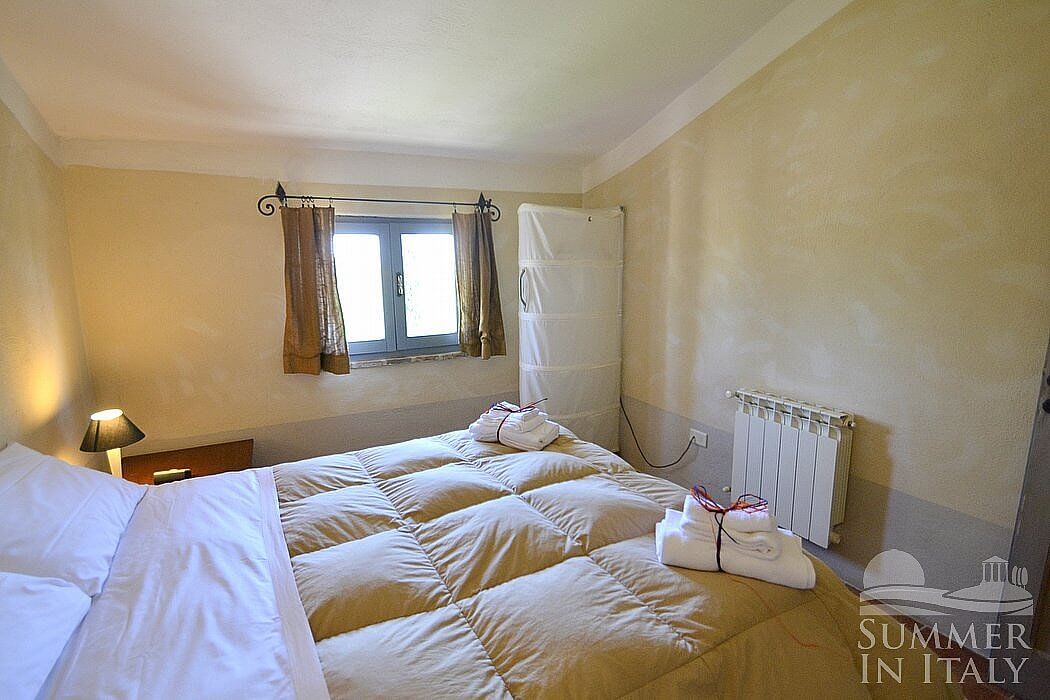 This room has no door. The bedroom has a matrimonial bed (160 cm/63 inches, wider than a queen-size bed). The room has a window with a view of the hill.