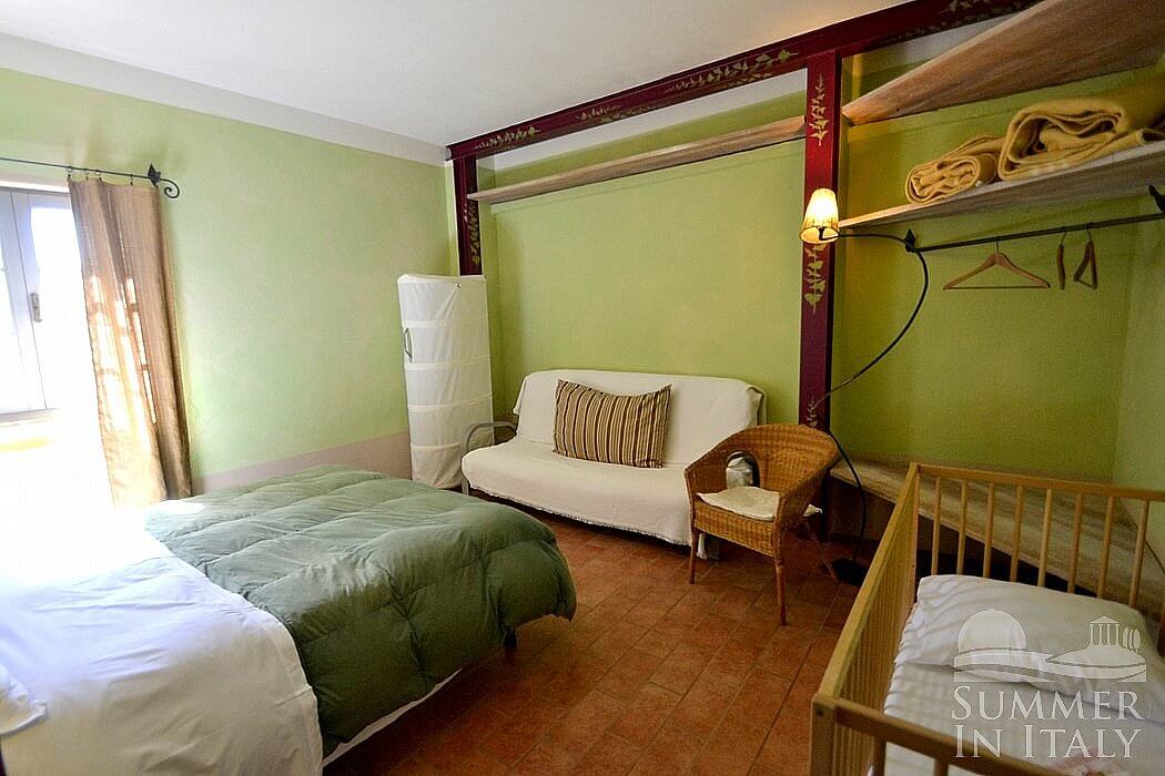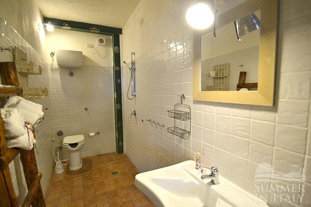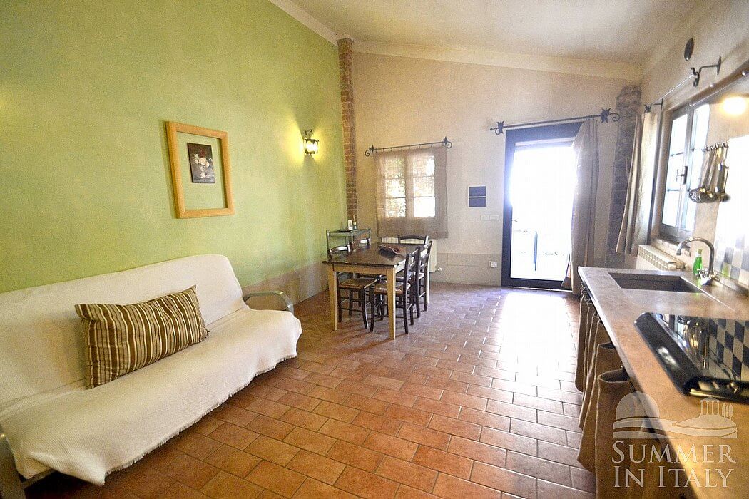 The living room is paved with terracotta tiles. The furnishings are simple and comfortable, and include a divan that unfolds into a double bed. In the living room you will also find a cooking area. The kitchenette is equipped with a four-burner gas cooker, a refrigerator with freezer, an Italian-style coffee-maker and a kettle. The dining table can accommodate six guests. From the living room you will be able to enter the patio through a French door. The room has a window with a view of the greenery.