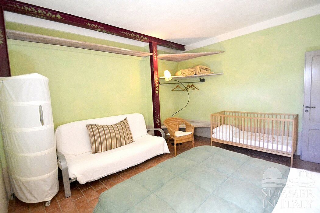 You will be able to enter the family room from the garden. In the family room you will also find a cooking area. The kitchenette is equipped with a four-burner gas cooker, an electric oven, a refrigerator with freezer and an Italian-style coffee-maker. The two dining tables can accommodate 16 guests. From the family room you will be able to enter the garden through a French door. The room also has three windows with a view of the greenery.