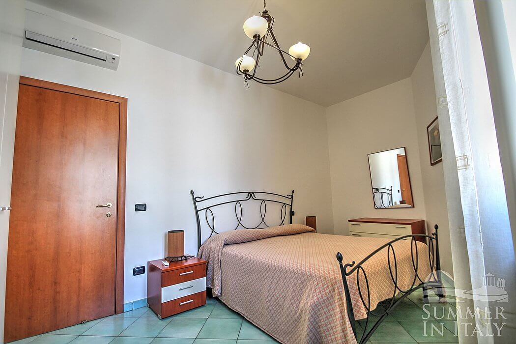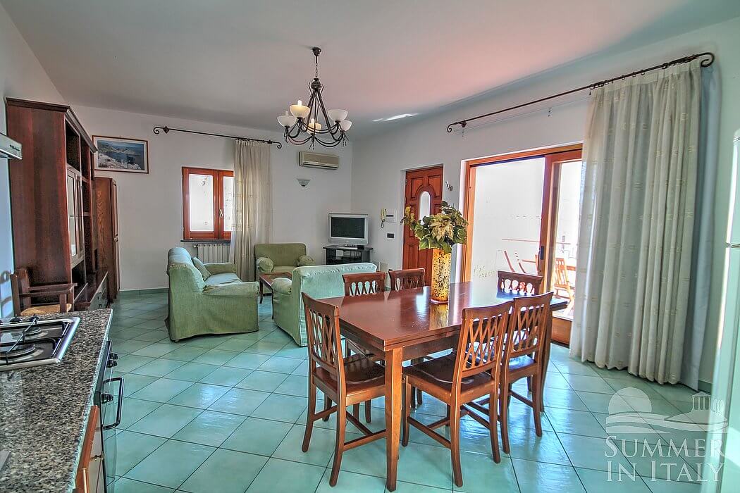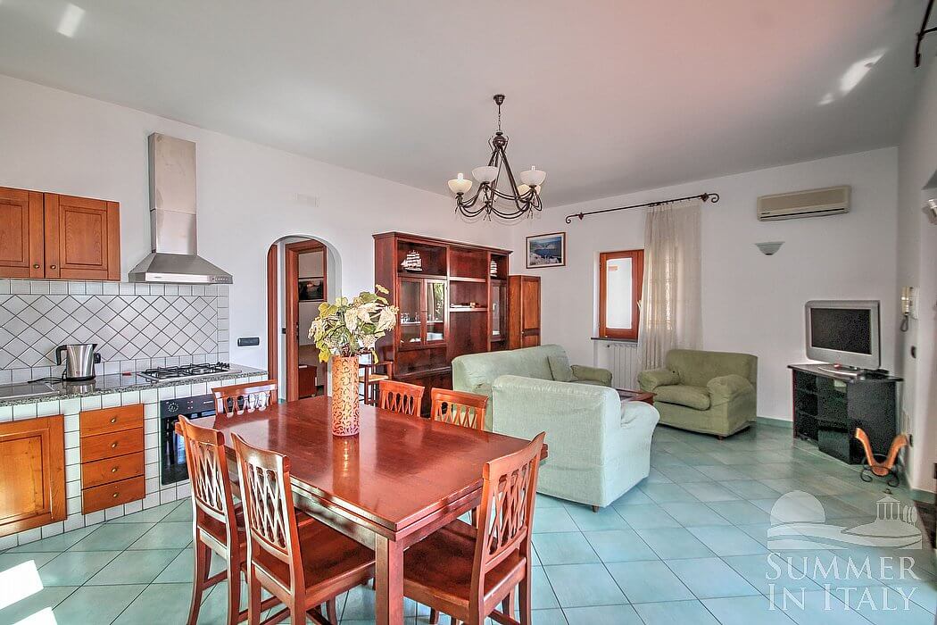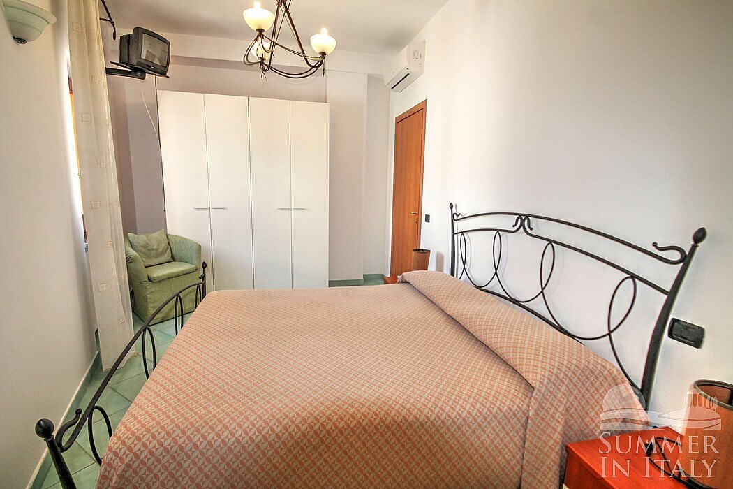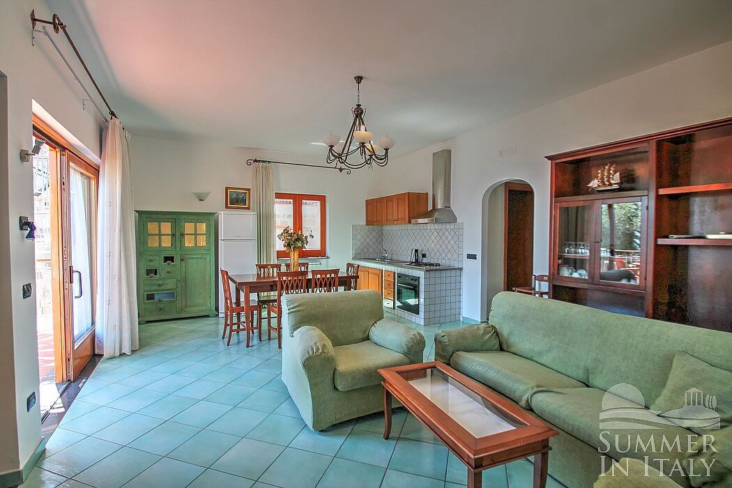 The furnishings of the living room are warm and elegant. The furnishings include two armchairs and a divan that unfolds into a double bed. In the living room you will also find a cooking area. The kitchenette is equipped with a four-burner gas cooker, an electric oven, a small refrigerator with freezer and an Italian-style coffee-maker. The dining table can accommodate seven guests. In this room you will find a satellite television (local channels). From the living room you will be able to enter the terrace with a view of the swimming pool and of the garden through a double-glazed French door. The room also has two windows. It is equipped with an air conditioning/heating unit.
