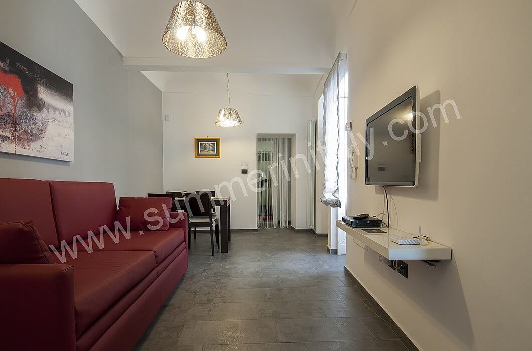 The furnishings of the living room are modern and comfortable. The furnishings include a divan bed for one guest. The dining table can accommodate four guests. In this room you will find a satellite television (local channels). From the living room you will be able to enter the small balcony with a view of the courtyard and of the surrounding houses through a French door. The room is equipped with an air conditioning/heating unit.