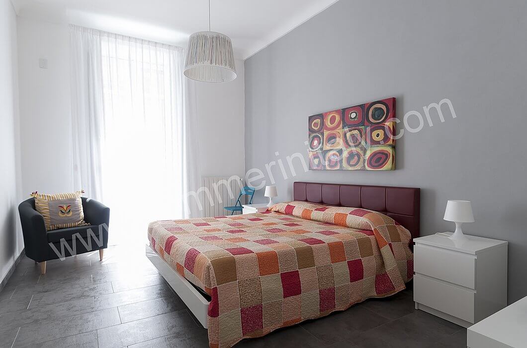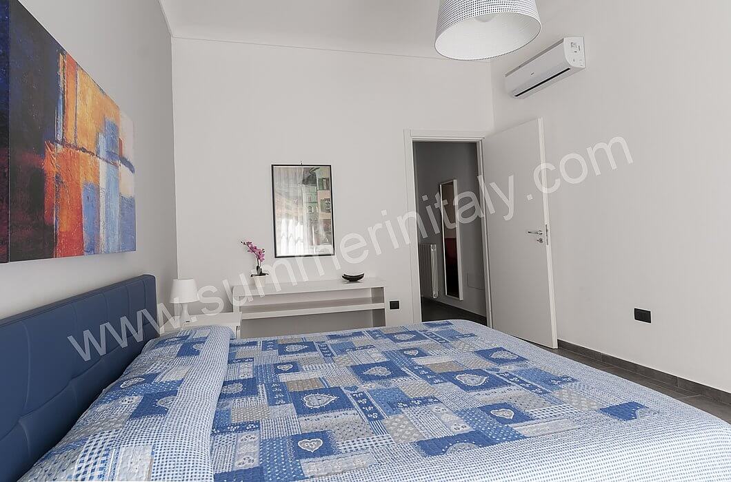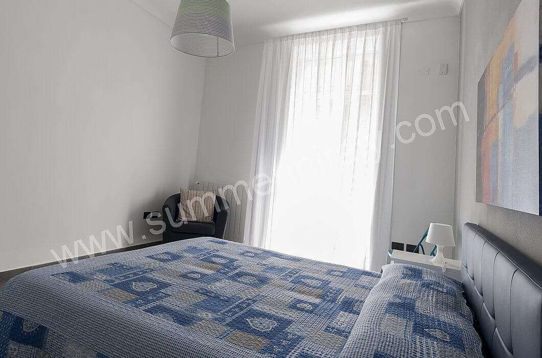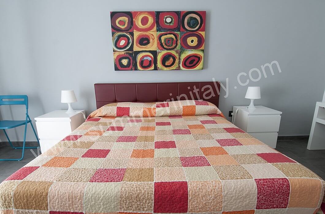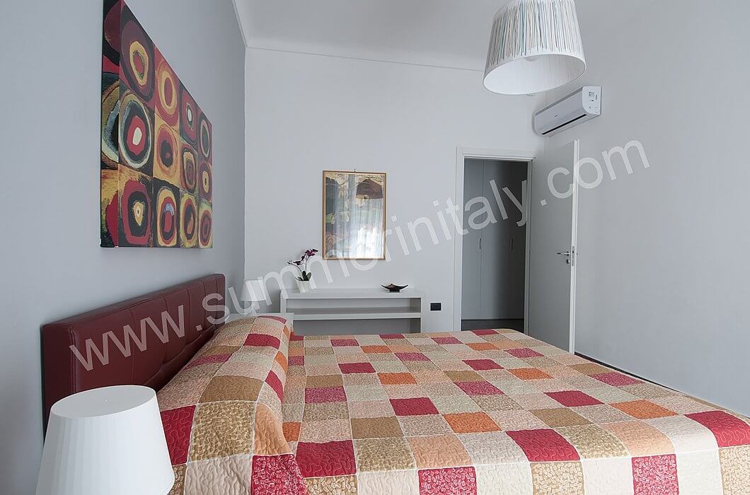 You will be able to enter the first bedroom from the through a corridor. The bedroom has a matrimonial bed (160 cm/62 inches, wider than a queen-size bed). From the bedroom you will be able to enter the small balcony with a view of the nearest building through a French door. The bedroom is equipped with an air conditioning/heating unit.