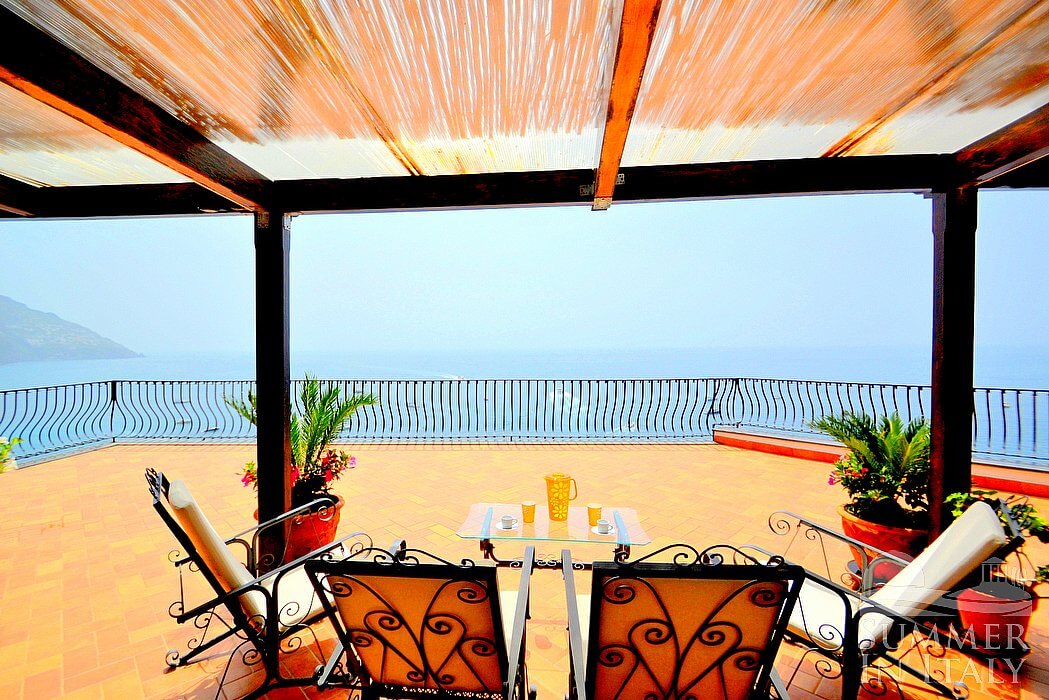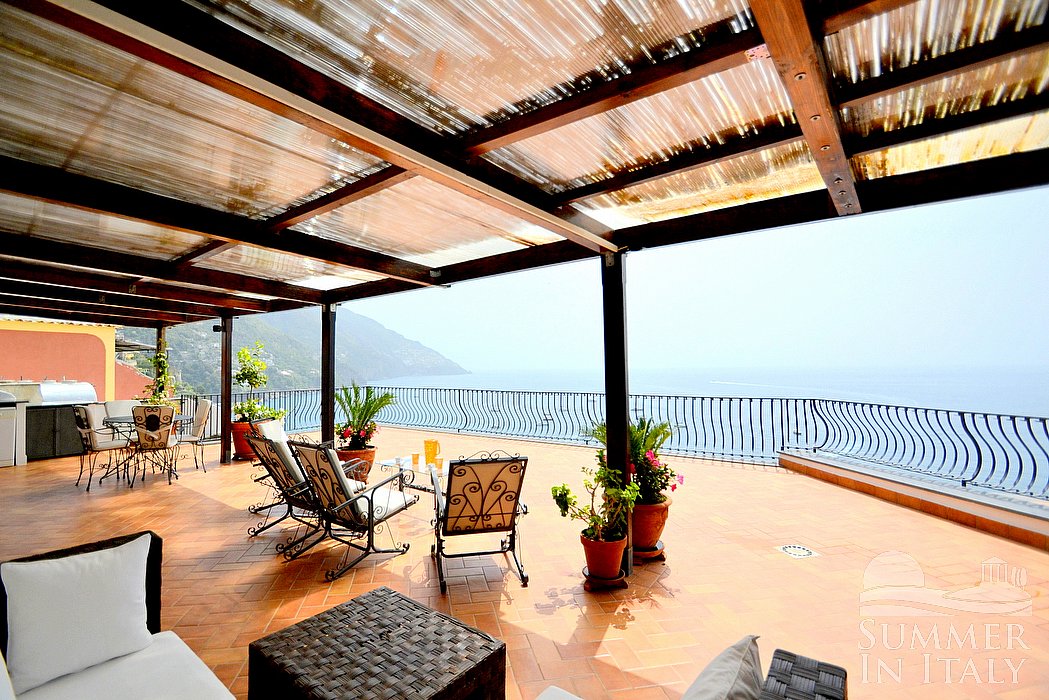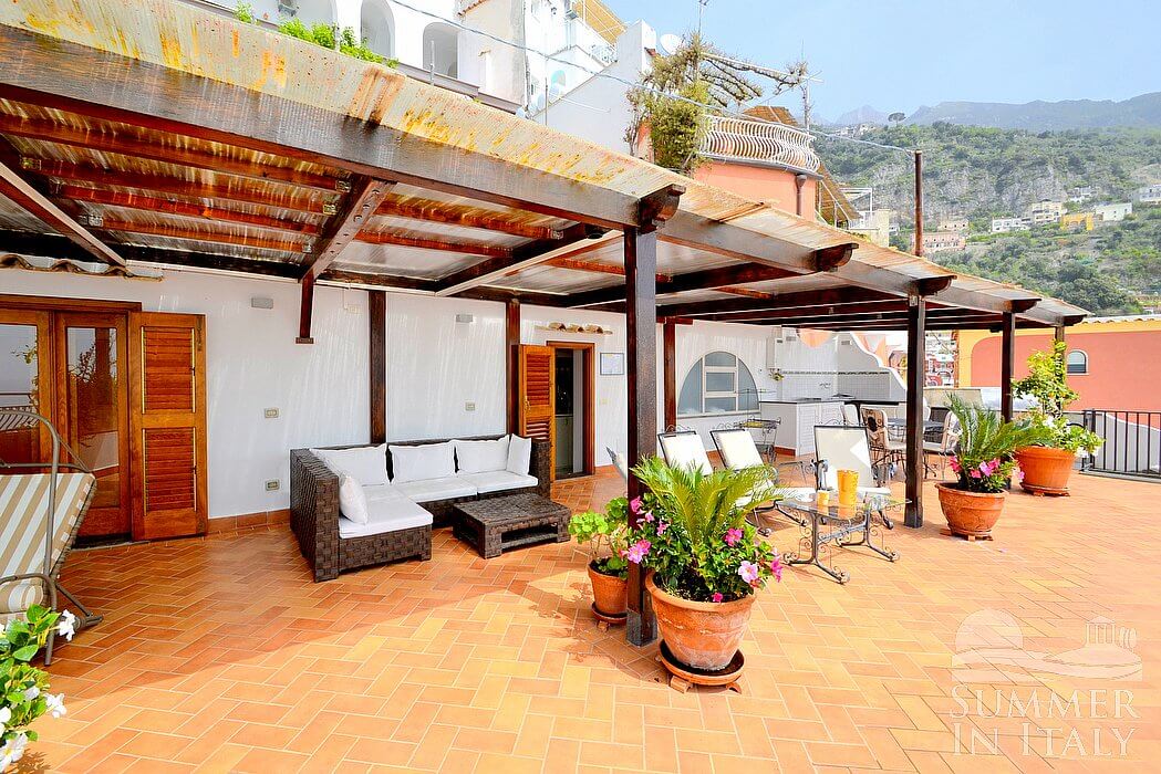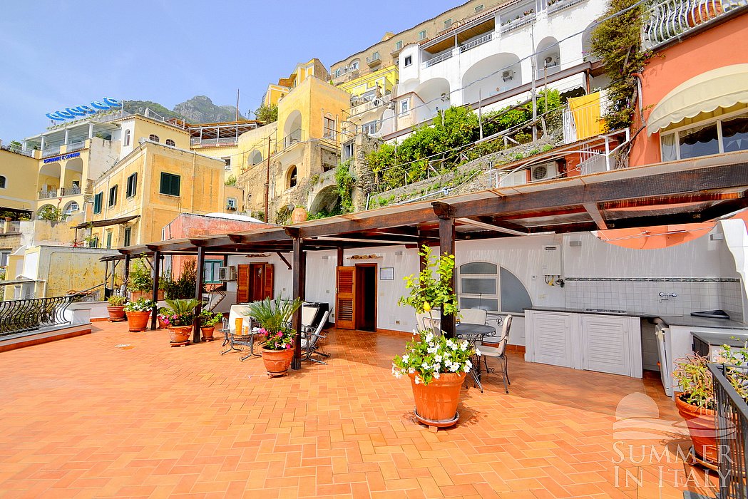The terrace is 100 square meters (1076 square feet) large. It is partly shaded by a wood roof. The terrace is equipped with a L-shaped wickerwork sofa, as well as with a table, chairs and two deck chairs. On the terrace you will find a cooking area. This area is equipped with a four-burner gas cooker and a dishwasher. From the terrace you will enjoy a view of the main beach of Positano (Spiaggia Grande), of the coast and of the sea.