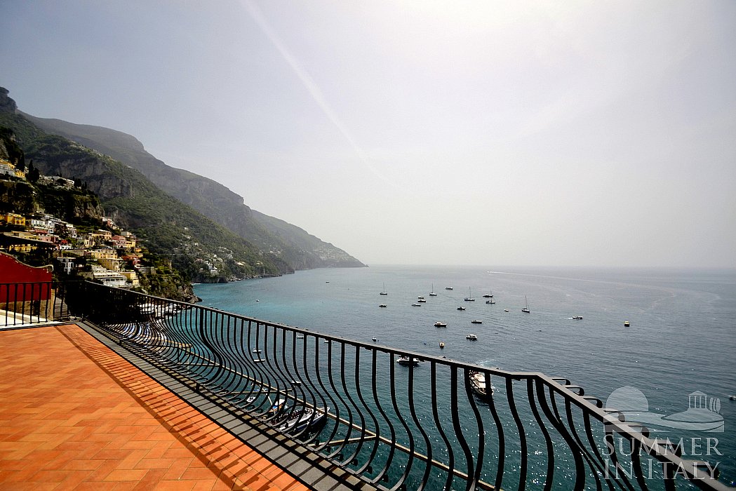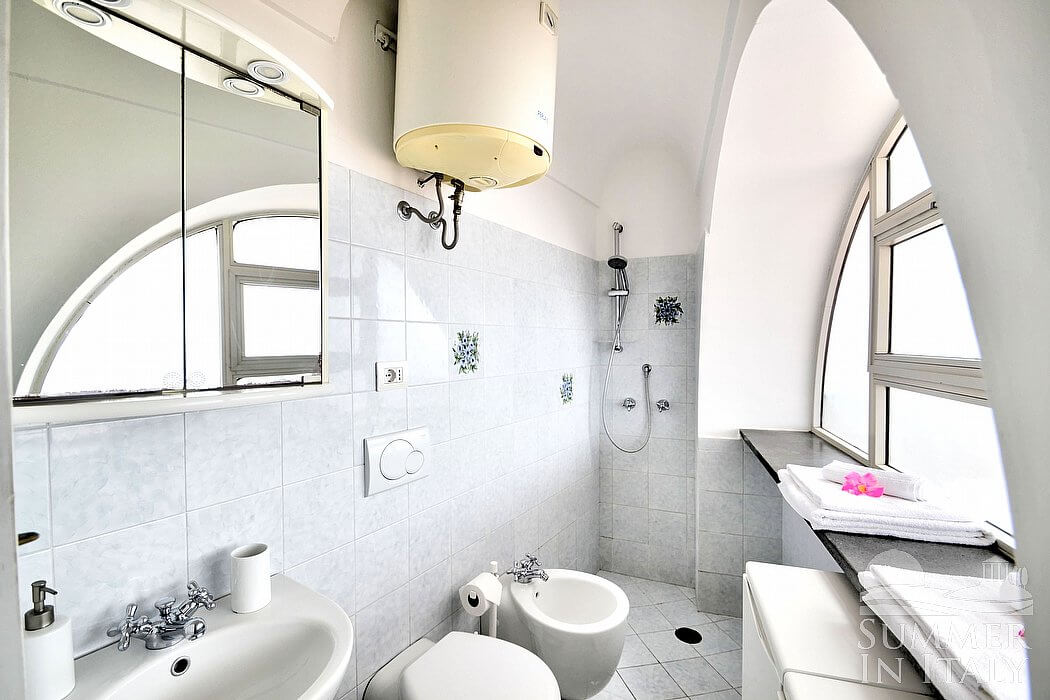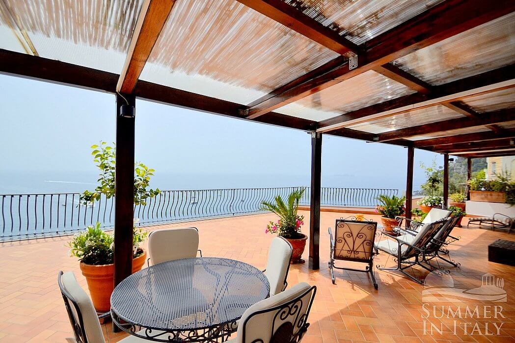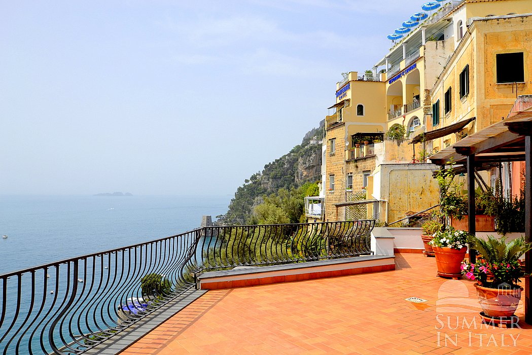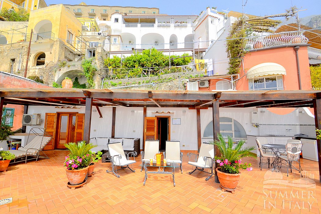 The terrace is 100 square meters (1076 square feet) large. It is partly shaded by a wood roof. The terrace is equipped with a L-shaped wickerwork sofa, as well as with a table, chairs and two deck chairs. On the terrace you will find a cooking area. This area is equipped with a four-burner gas cooker and a dishwasher. From the terrace you will enjoy a view of the main beach of Positano (Spiaggia Grande), of the coast and of the sea.