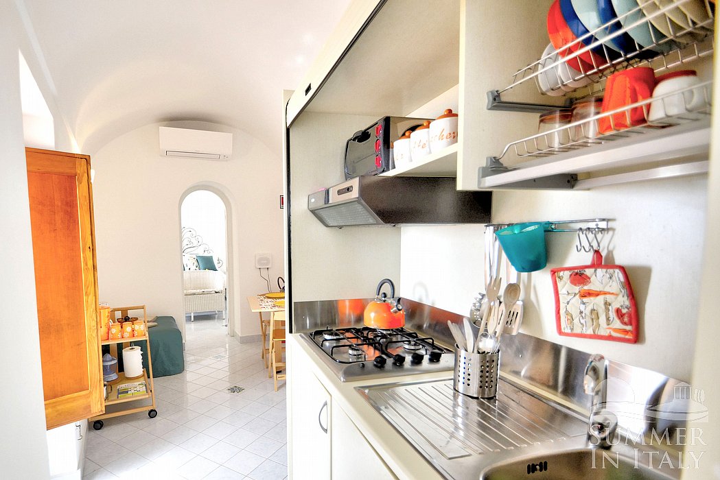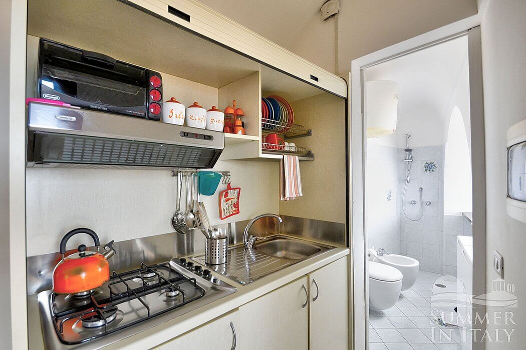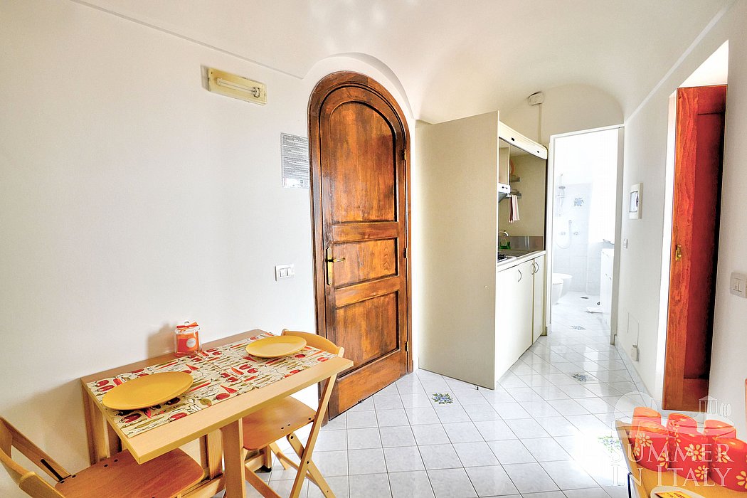 The ceiling of the living room is vaulted. The furnishings are simple. The furnishings include an armchair. In the living room you will also find a cooking area. The kitchenette can be closed in a cupboard and is equipped with a four-burner gas cooker, a small electric oven, a small refrigerator with freezer, an Italian-style coffee-maker and a kettle. The dining table can accommodate two guests. From the living room you will be able to enter the terrace with a view of the sea through a French door. The room is equipped with an air conditioning/heating unit.