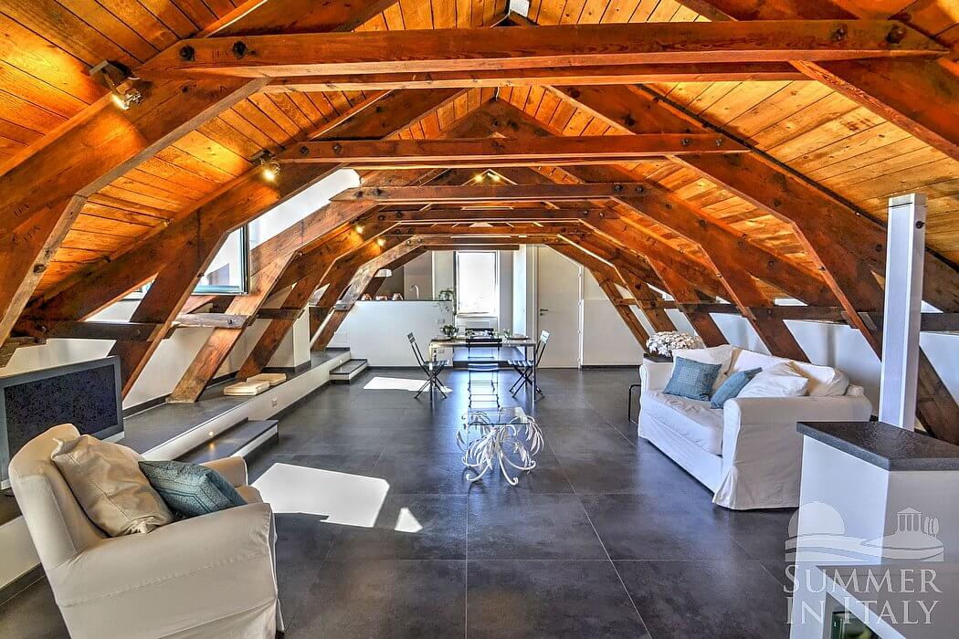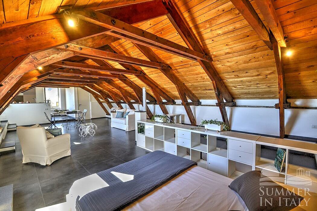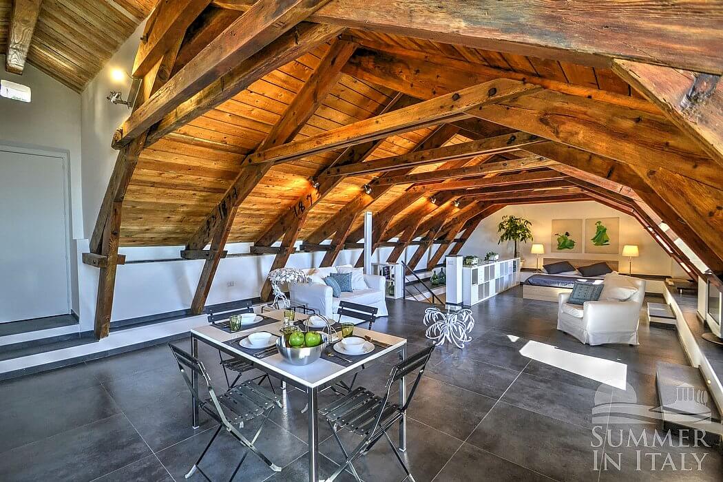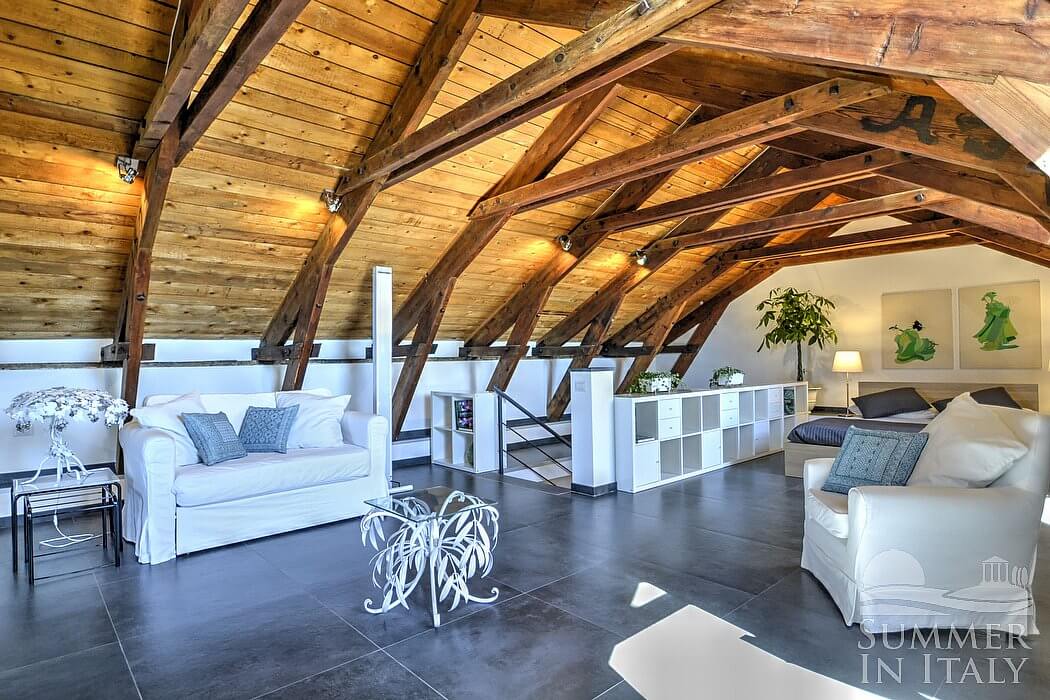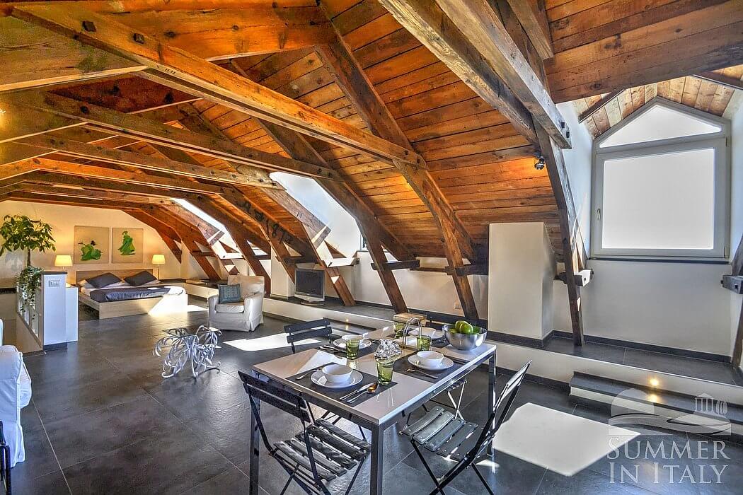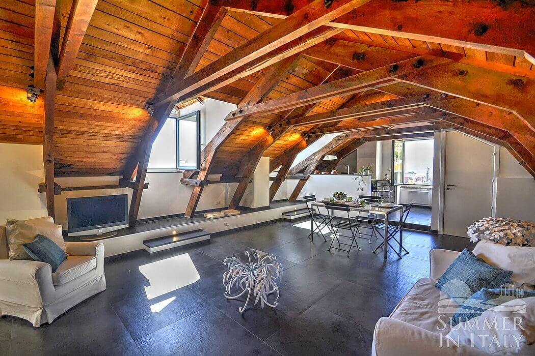 The ceiling of the living room is sloped and has characteristic exposed wood beams. The furnishings are elegant. Here you will find a matrimonial bed (160 cm/63 inches, wider than a queen-size bed). The furnishings include an armchair and a divan bed for one guest. In the living room you will also find a cooking area. The kitchenette is equipped with a two-burner electric cooker, a small refrigerator with freezer, a microwave oven, an Italian-style coffee-maker, an American-style coffee-maker (bring your filters!) and a kettle. The dining table can accommodate four guests. In this room you will find a smart TV. The room has three windows with a nice view of the sea. It is equipped with an air conditioning/heating unit.