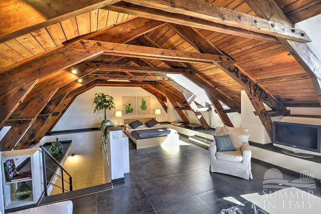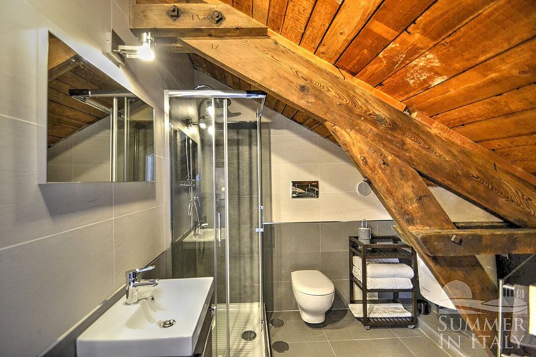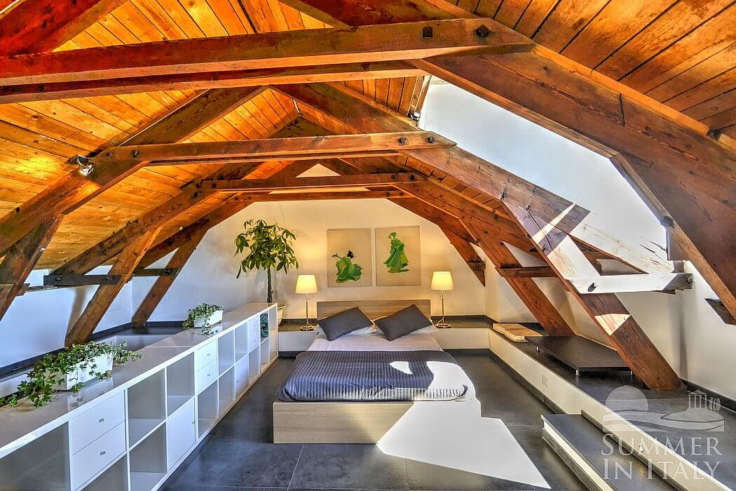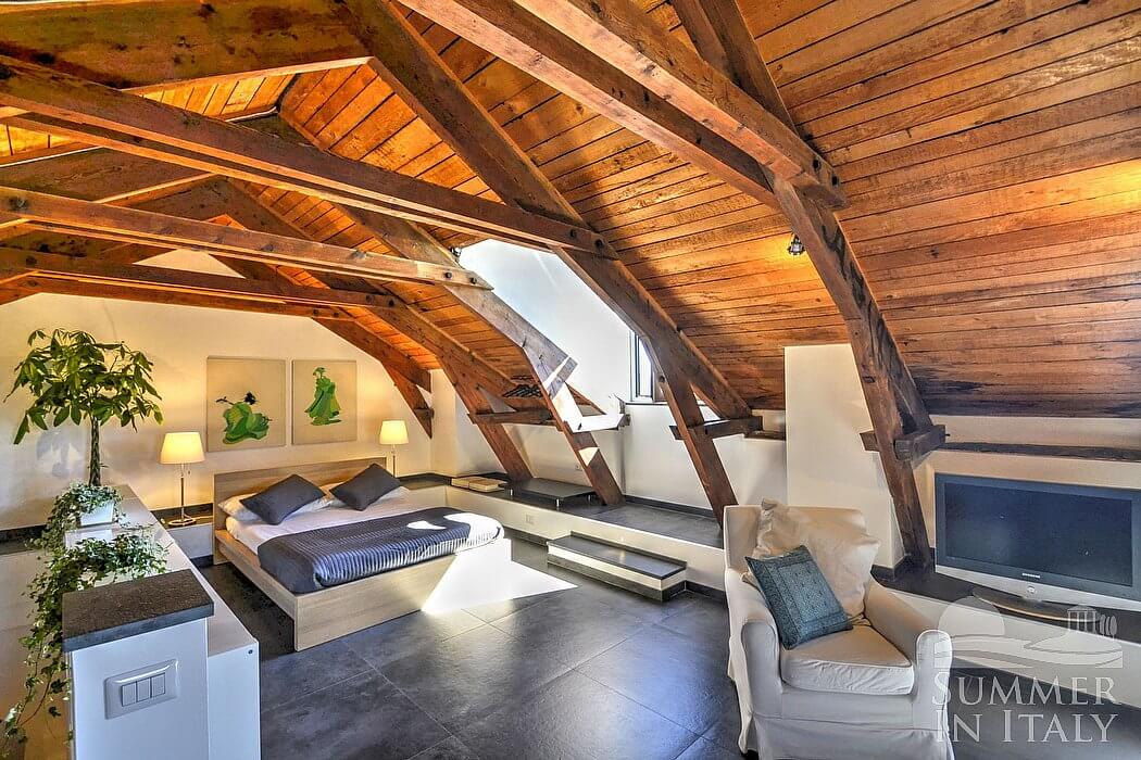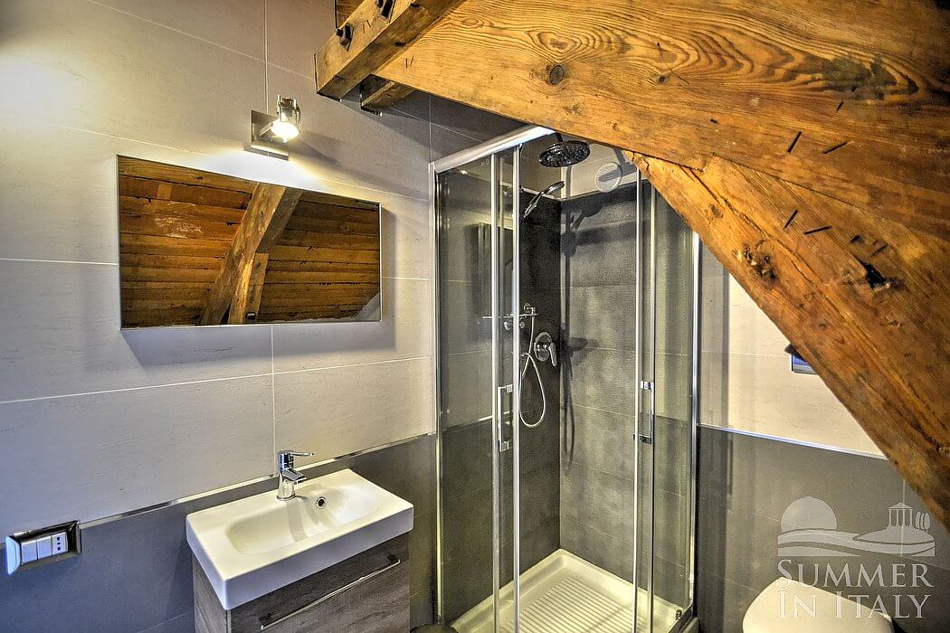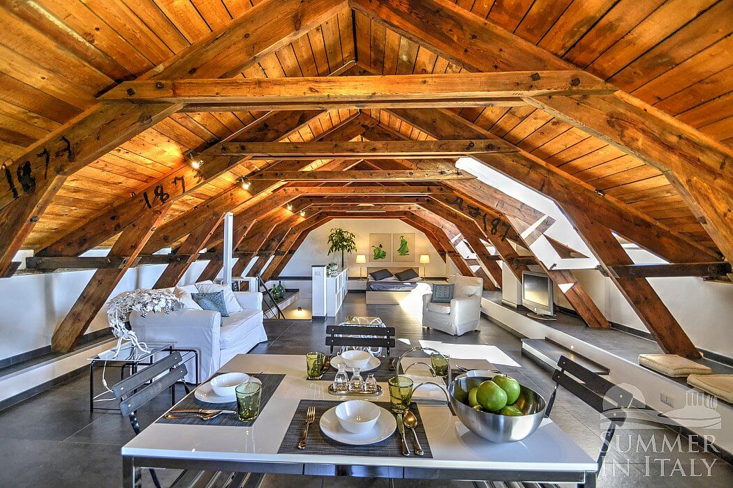The ceiling of the living room is sloped and has characteristic exposed wood beams. The furnishings are elegant. Here you will find a matrimonial bed (160 cm/63 inches, wider than a queen-size bed). The furnishings include an armchair and a divan bed for one guest. In the living room you will also find a cooking area. The kitchenette is equipped with a two-burner electric cooker, a small refrigerator with freezer, a microwave oven, an Italian-style coffee-maker, an American-style coffee-maker (bring your filters!) and a kettle. The dining table can accommodate four guests. In this room you will find a smart TV. The room has three windows with a nice view of the sea. It is equipped with an air conditioning/heating unit.