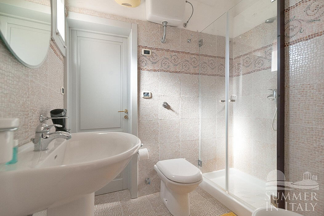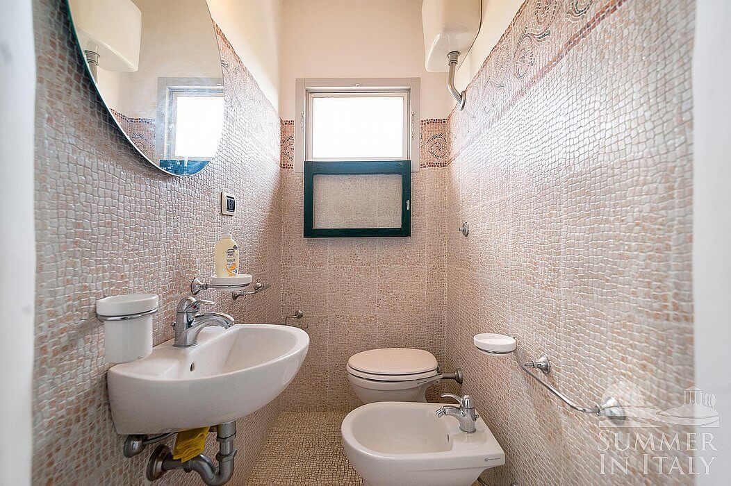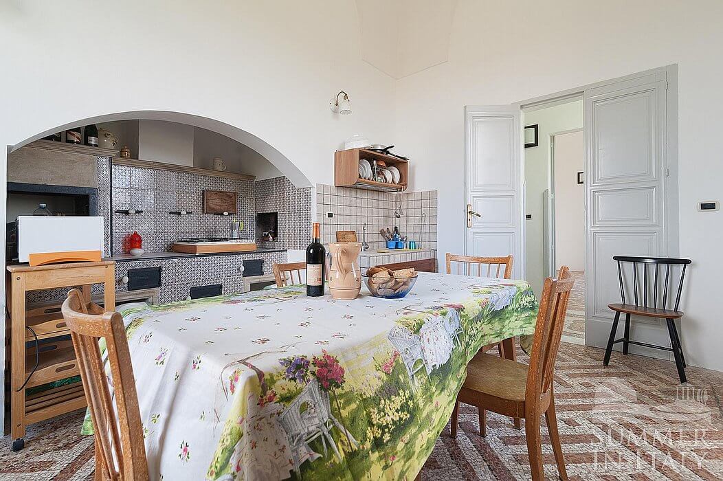 You will be able to enter the kitchen through an access area. The ceiling of the kitchen is high and vaulted. It is in a rustic style, equipped with a four-burner gas cooker, a small electric oven, a refrigerator with freezer and an Italian-style coffee-maker. The dining table can accommodate six guests. The kitchen has two windows.