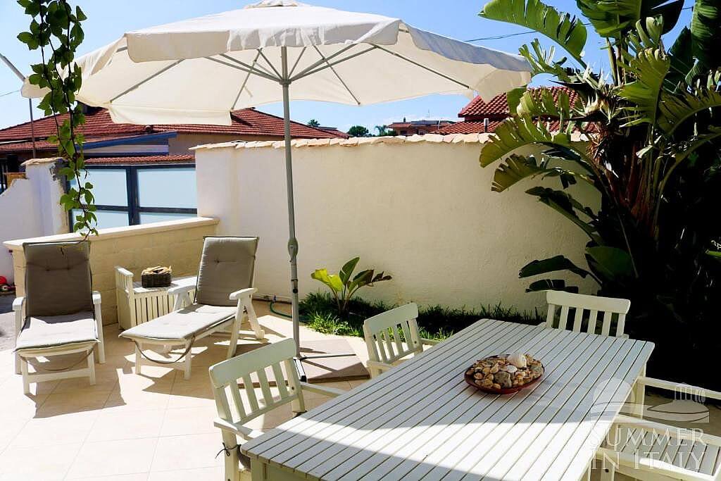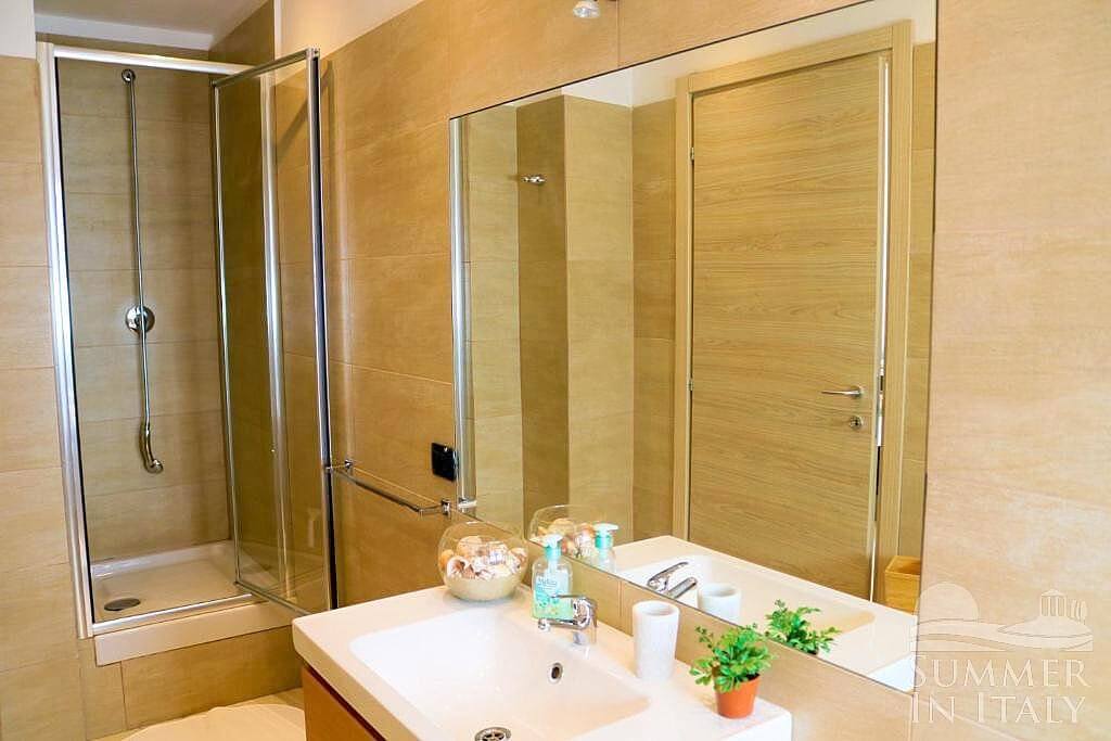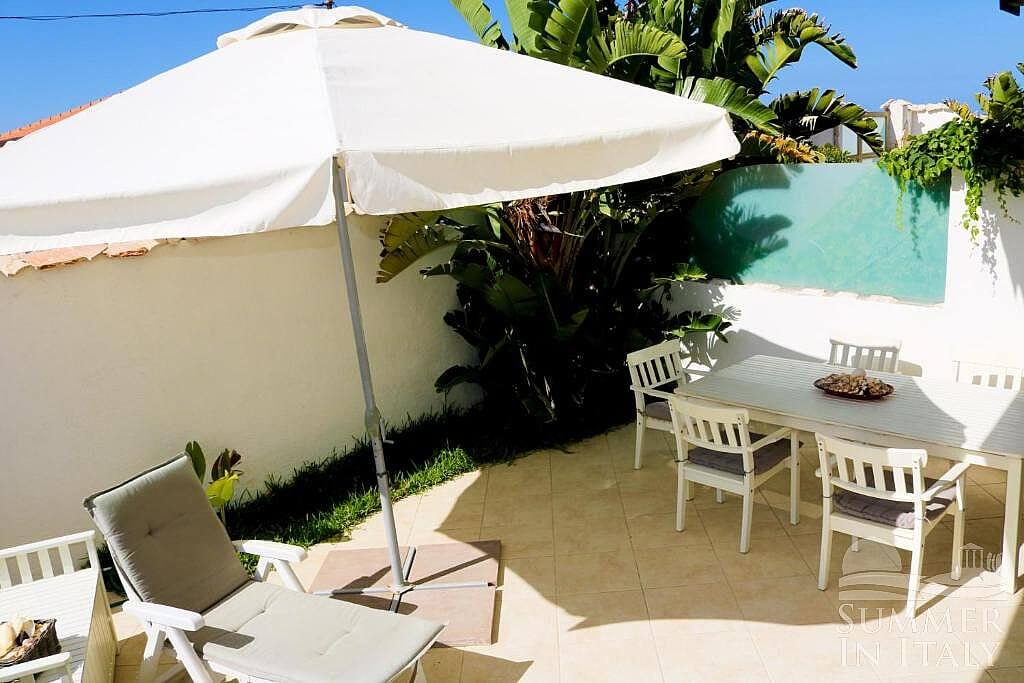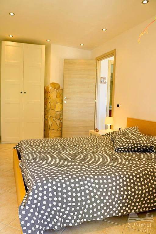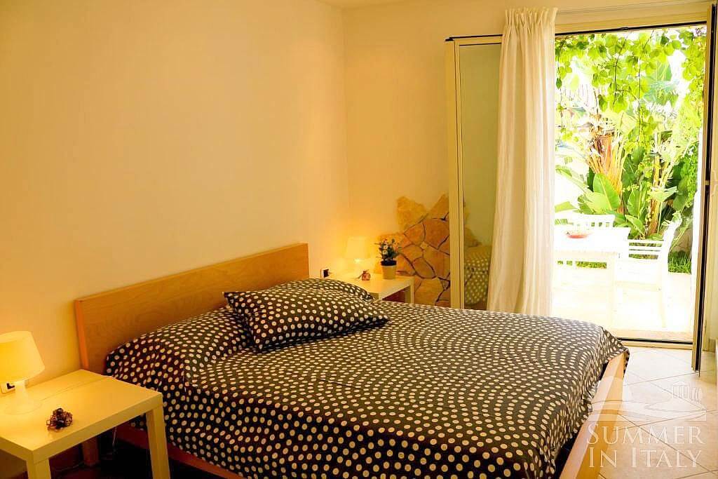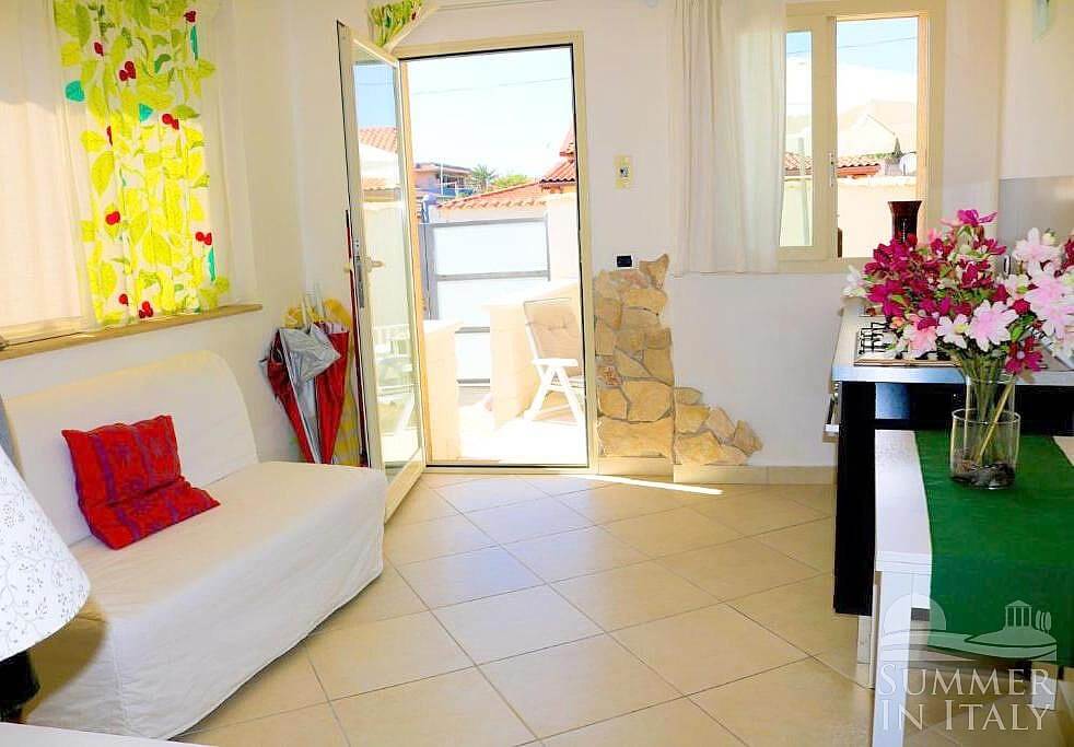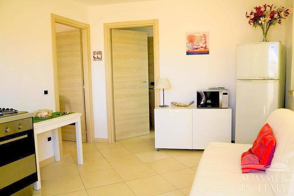 The furnishings of the kitchen are simple. It is equipped with a four-burner gas cooker, an electric oven, a refrigerator with freezer, a microwave oven and an Italian-style coffee-maker. The furnishings of the kitchen include a divan that unfolds into a double bed (140 cm/55 inches). From the kitchen a double-glazed French door will take you to the patio.
