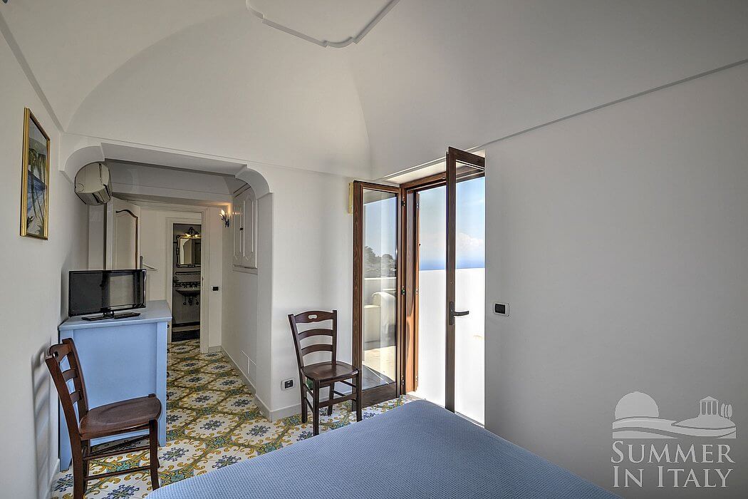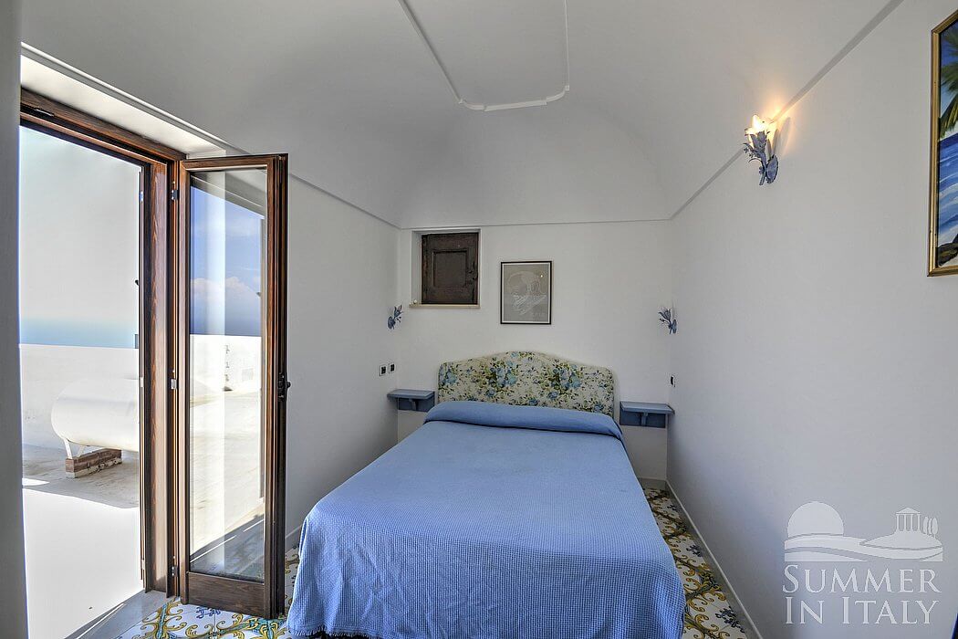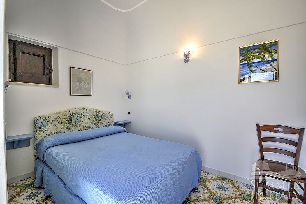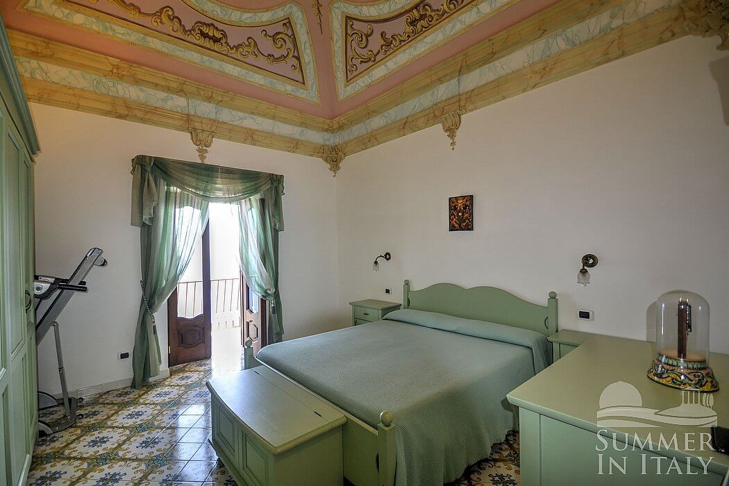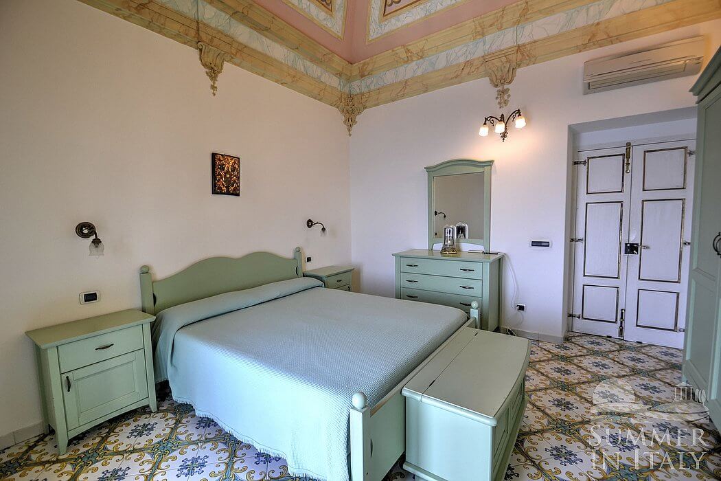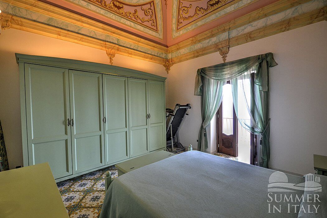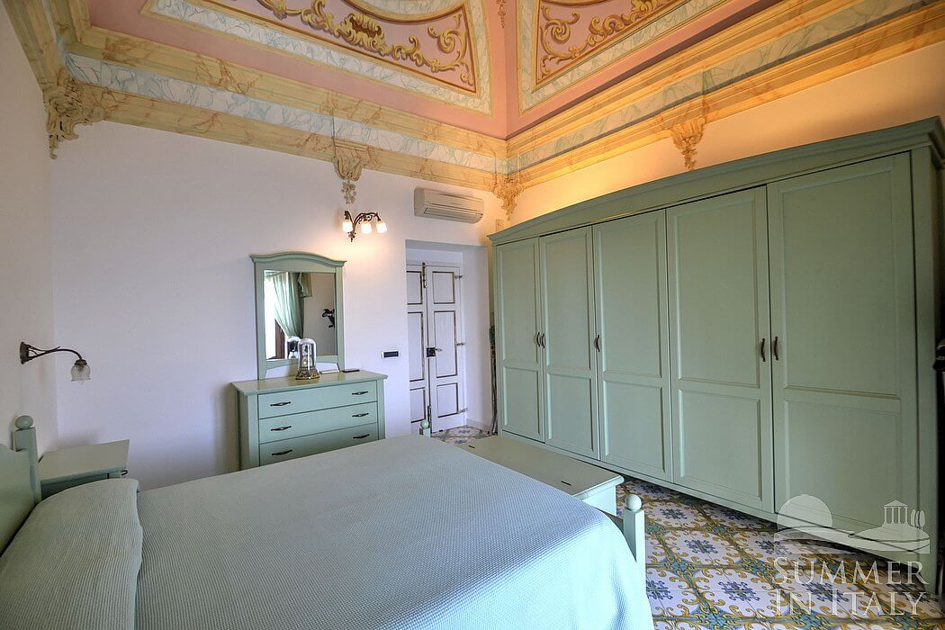You will be able to enter the first bedroom from the corridor. The ceiling is vaulted and frescoed. The furnishings are classic and welcoming. The room has a matrimonial bed (160 cm/62 inches, wider than a queen-size bed). From the bedroom you will be able to enter a small terrace with a view of the sea and of the coastline through a French door. The bedroom is equipped with an air conditioning/heating unit.