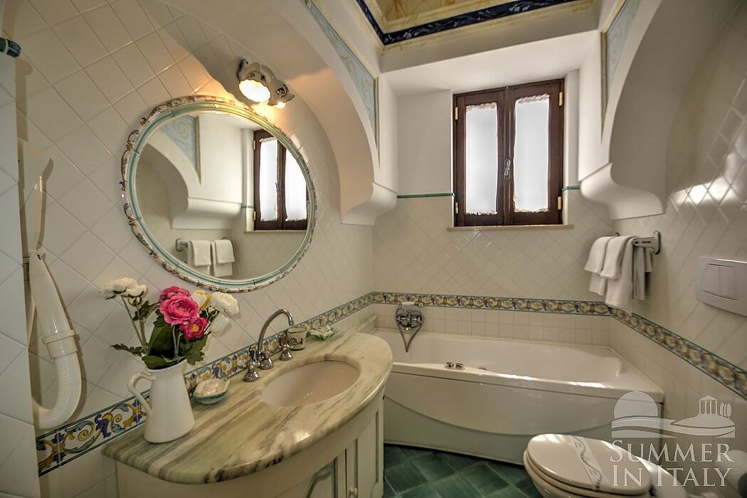 The first bathroom is tiled with lucid handmade majolica tiles and equipped with a washbasin, a toilet, a Jacuzzi bathtub and a hairdryer. You will be able to enter the bathroom from the corridor.