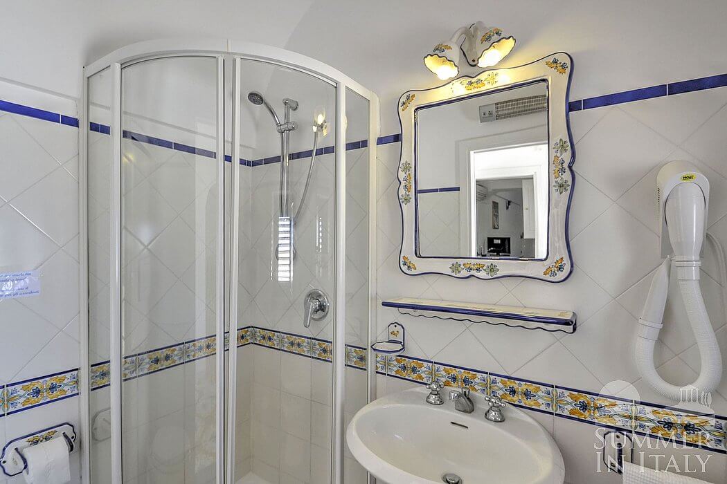 The second bathroom is tiled with lucid handmade majolica tiles and equipped with a washbasin, a toilet and a fully enclosed shower. You will be able to enter the bathroom from the corridor.