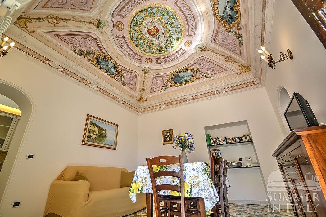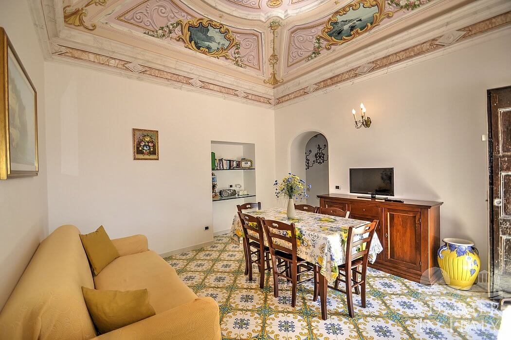 The door that leads into the living room is overlooked by a rich baroque decoration. In the middle of this decoration there is a portrait of Saint Luke painted on majolica tiles. According to the Catholic traditions, Saint Luke is the patron saint of the painters, and the cathedral of Praiano is dedicated to Saint Luke.