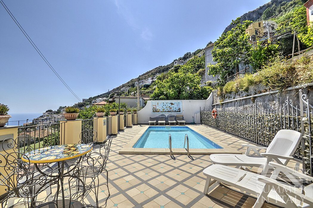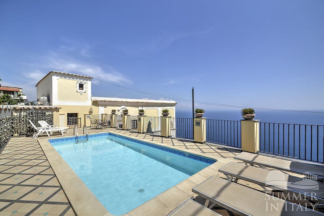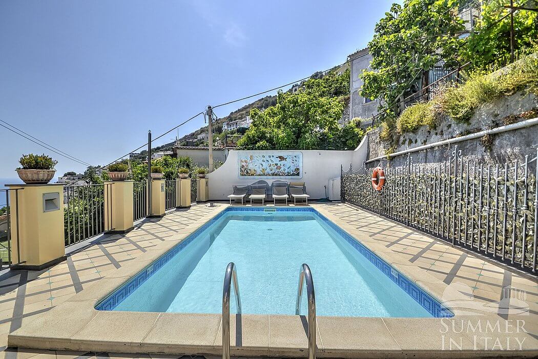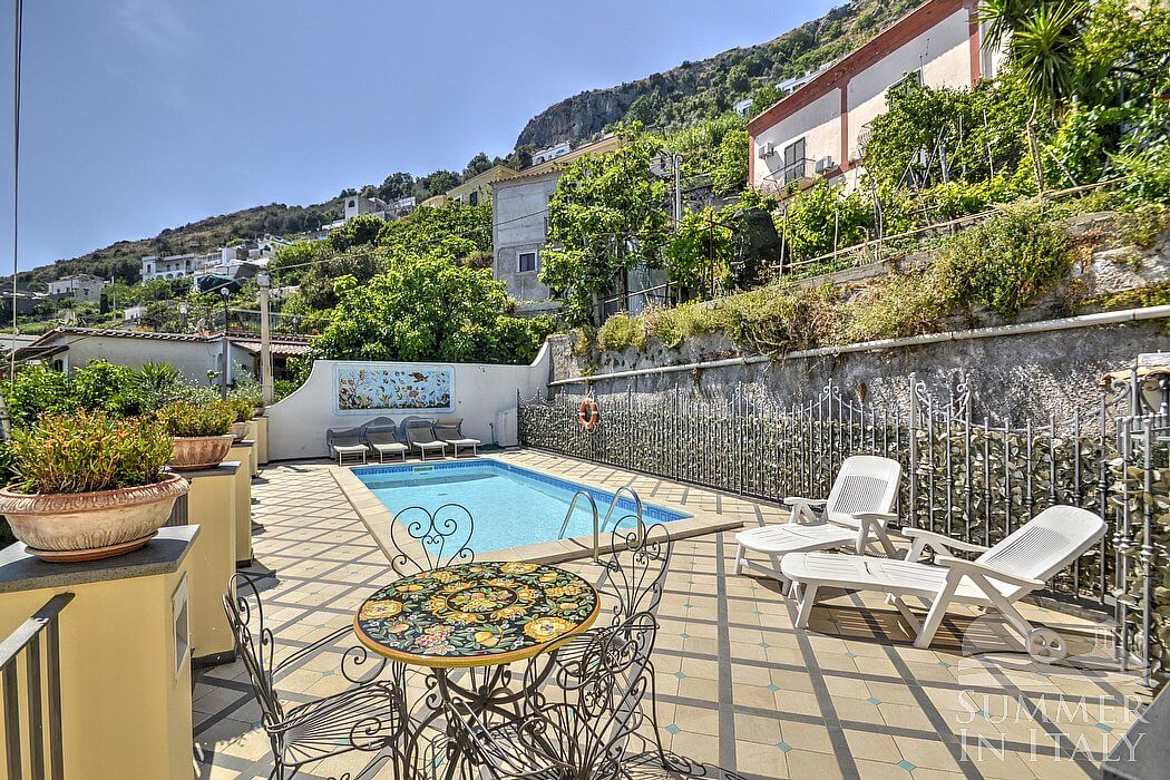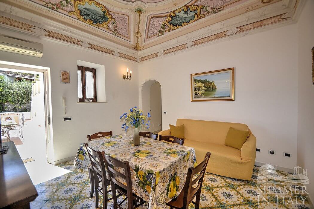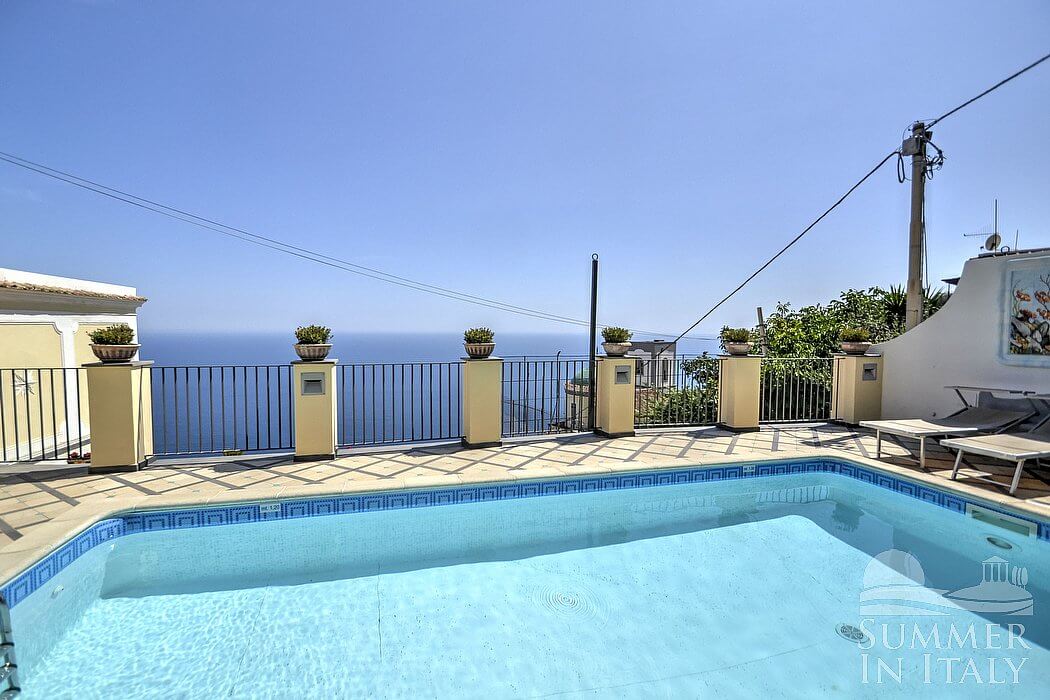 The villa is beautiful, and welcoming as well: the terrace at the entrance is connected to the living room, and on this terrace you will find a large table made of decorated majolica tiles that awaits you for your outdoor meals. Along a wall, in front of the sea, you will find a white long brickwork bench of seventeenth-century design, perfect to enjoy the sun. At night time you will be able to light the terrace to dine outdoor.  Climbing a few steps from the terrace you will reach a small paved garden, where grapevines and lemon trees are grown. In the middle of the garden lies a small swimming pool. The swimming pool has a view of the sea as well.