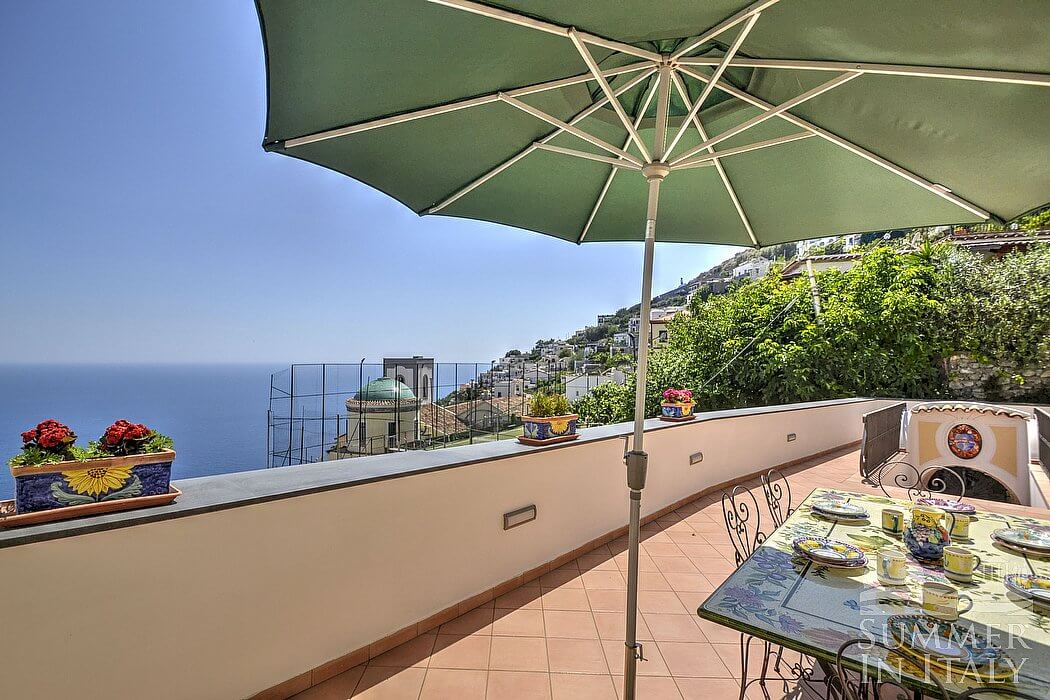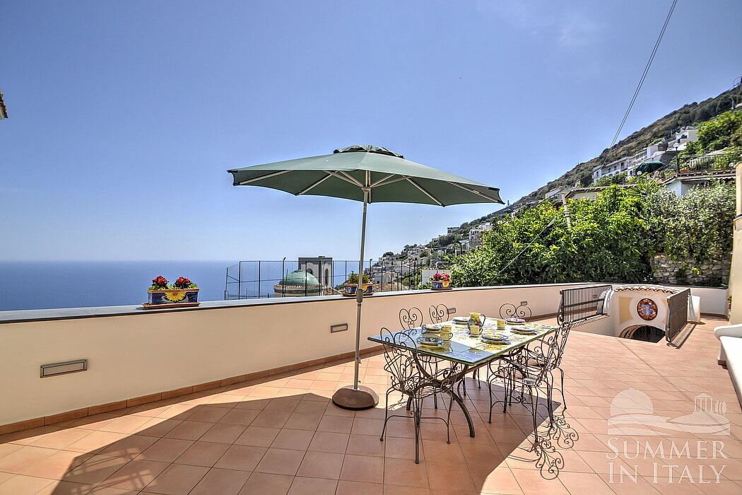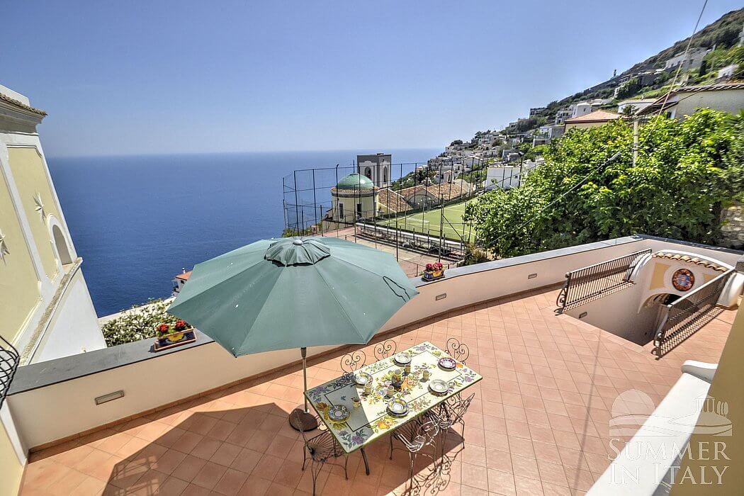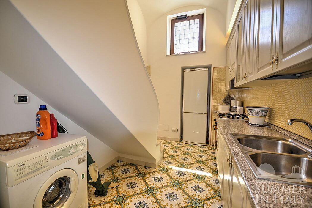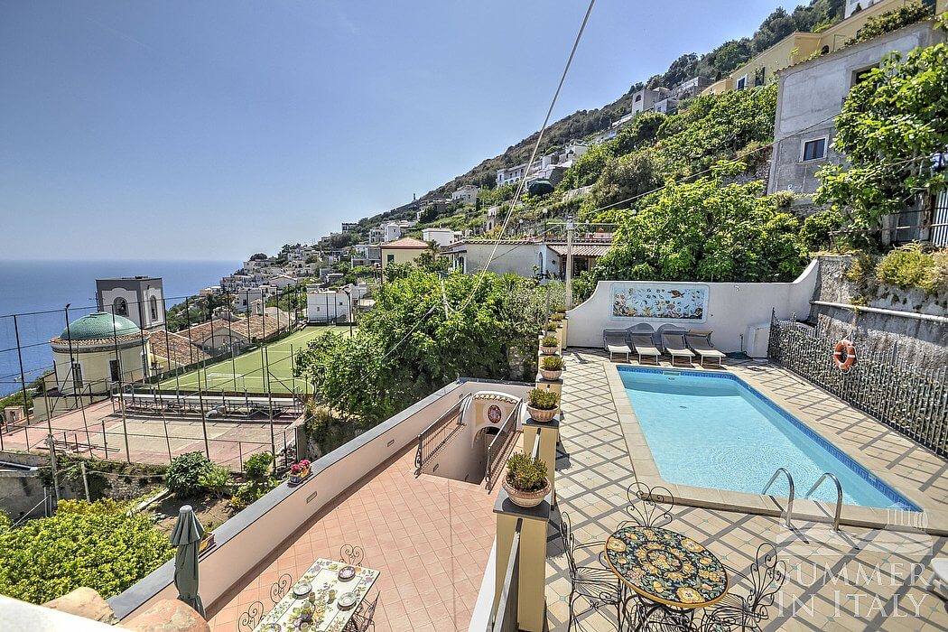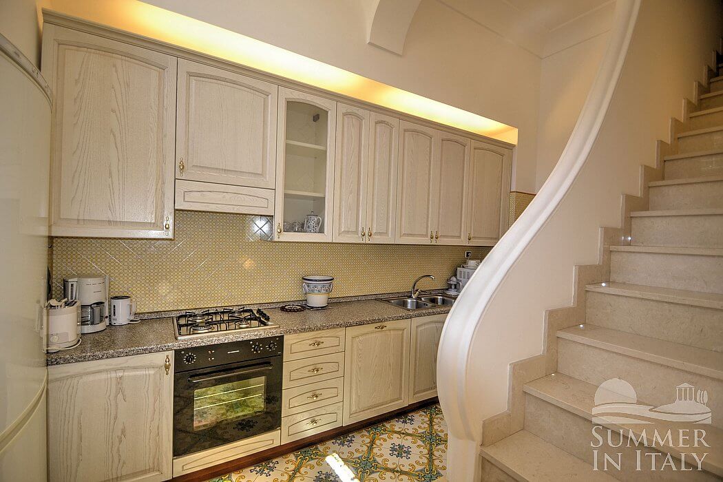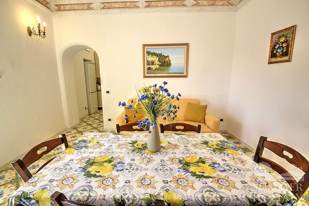 The villa is beautiful, and welcoming as well: the terrace at the entrance is connected to the living room, and on this terrace you will find a large table made of decorated majolica tiles that awaits you for your outdoor meals. Along a wall, in front of the sea, you will find a white long brickwork bench of seventeenth-century design, perfect to enjoy the sun. At night time you will be able to light the terrace to dine outdoor.  Climbing a few steps from the terrace you will reach a small paved garden, where grapevines and lemon trees are grown. In the middle of the garden lies a small swimming pool. The swimming pool has a view of the sea as well.