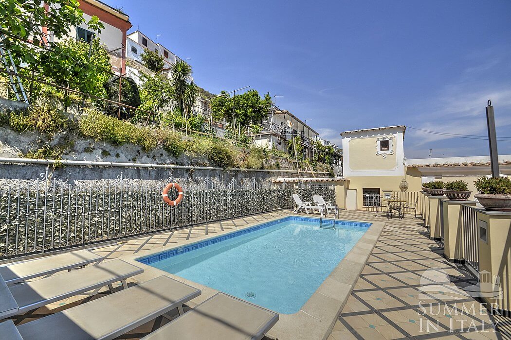 The swimming pool is 3 meters (10 feet) large by 7 meters (23 feet) long, from 1.20 meter (4 feet) to 1.5 meters (5 feet) deep. The area is equipped with a table, chairs and sun loungers. It is partly shaded by an awning. From the swimming pool you will enjoy a view of the sea and of the coast of Amalfi. The pool is open from the beginning of May until the end of October.