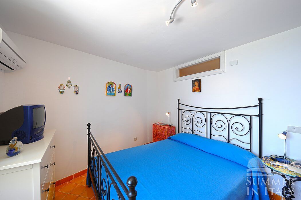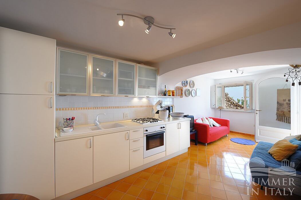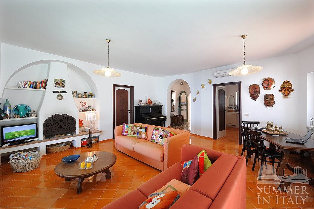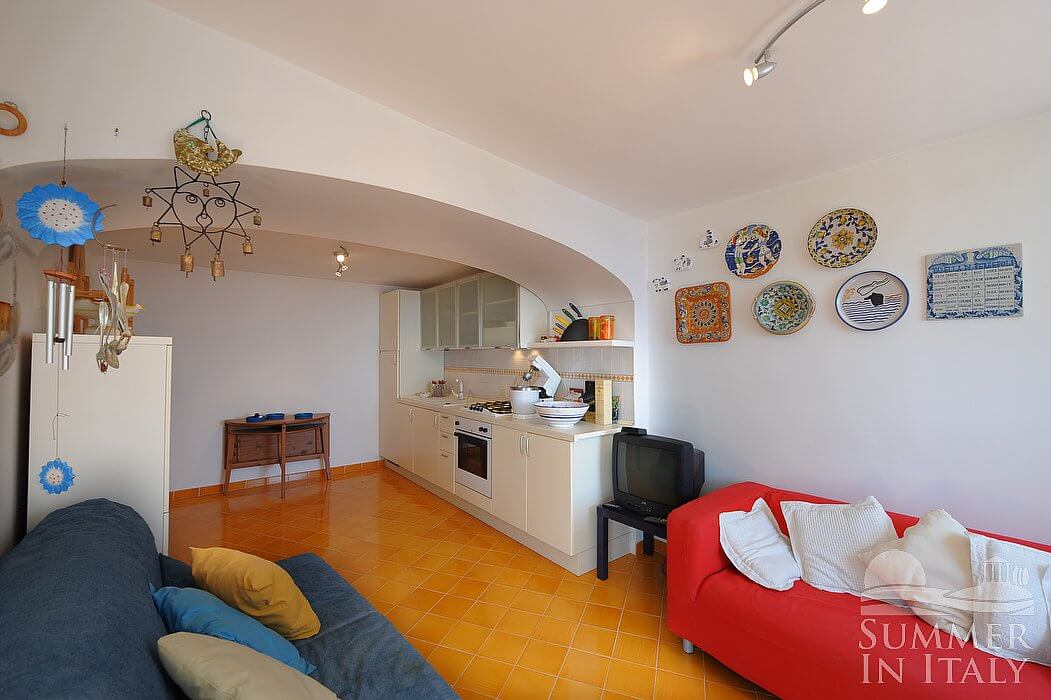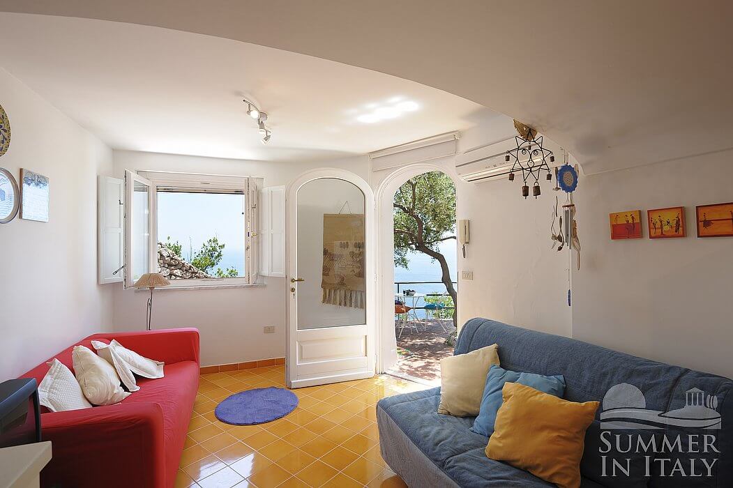 The first living room is paved with original majolica tiles. The furnishings are warm and welcoming. The furnishings include two sofas. In the living room you will also find a cooking area. The kitchenette is equipped with a four-burner gas cooker, an electric oven, a refrigerator with freezer, a microwave oven and an Italian-style coffee-maker. The dining table can accommodate four guests. In this room you will find a satellite television (local channels). From the living room you will be able to enter the terrace with a view of the sea and of the coastline through a French door. The room also has a window. It is equipped with an air conditioning/heating unit.
