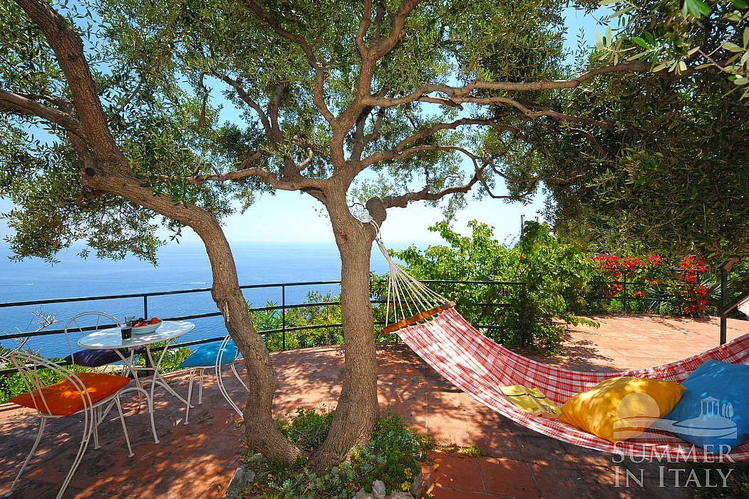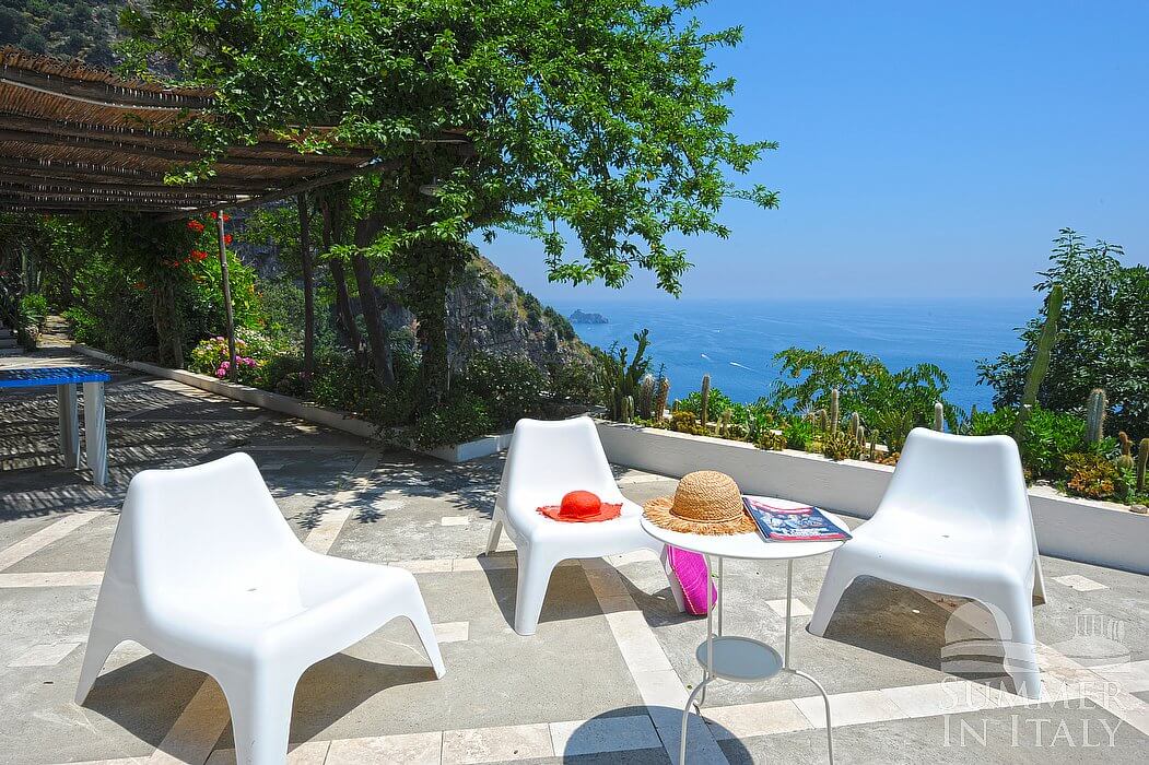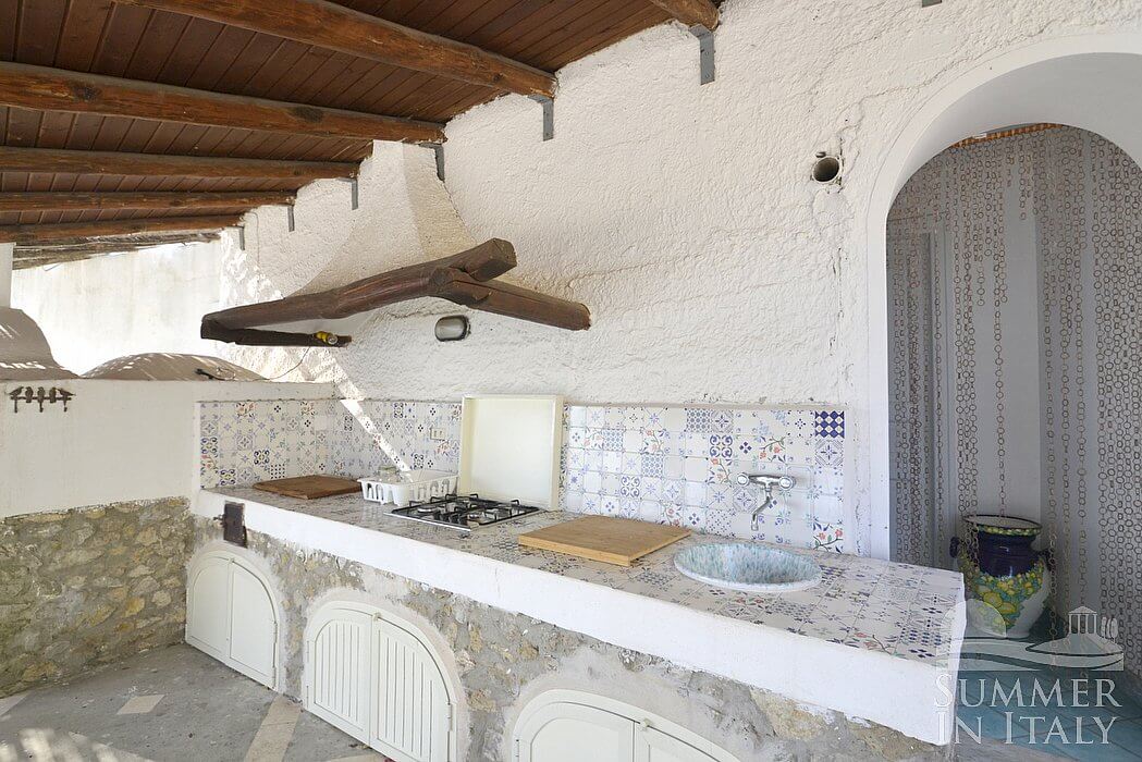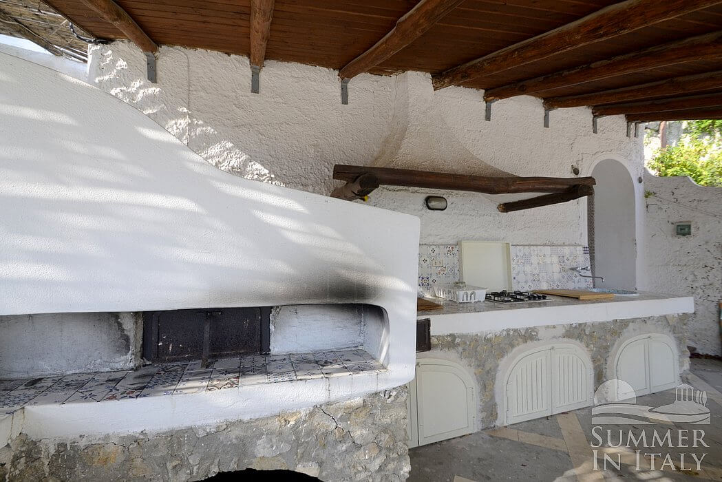 The patio is 50 square meters (540 square feet) large. It is partly shaded by a characteristic pergola with a bamboo roof and by a wood roof. It is equipped with tables, chairs and sun loungers. On the patio you will find a cooking area. This area is equipped with a four-burner gas cooker and a small refrigerator with freezer. Here you will also find a brickwork barbecue and a small wood-fired pizza oven. From the patio you will enjoy a gorgeous view of the sea and of the coastline.
