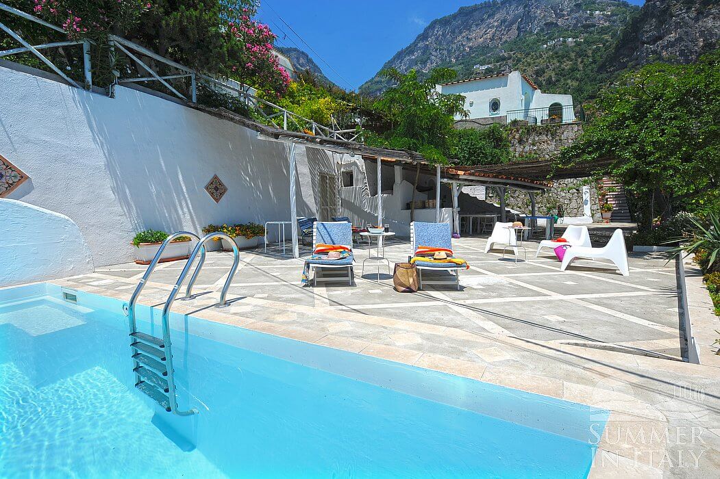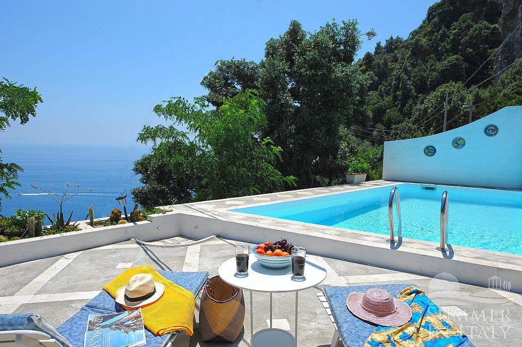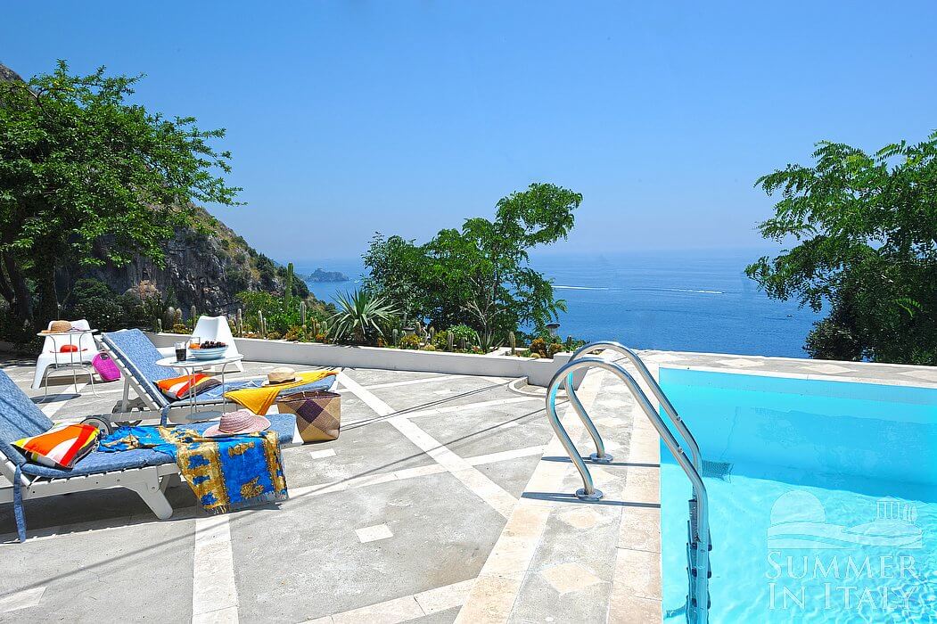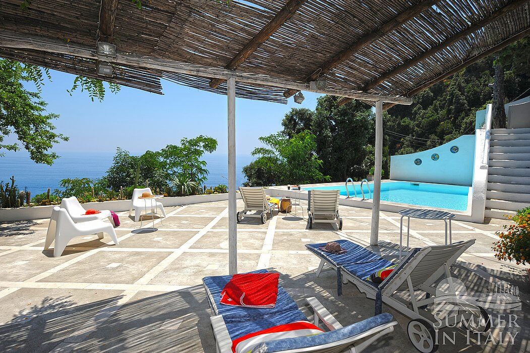 You will reach the swimming pool from the villa going down approximately 30 stairway steps. The pool is 7 meters (23 feet) large by 9 meters (30 feet) long. It has a whirlpool corner. The area is equipped with tables and sun loungers. From the swimming pool you will enjoy an incredible view of the sea and of the coastline. The pool is open from the beginning of April until the end of October.