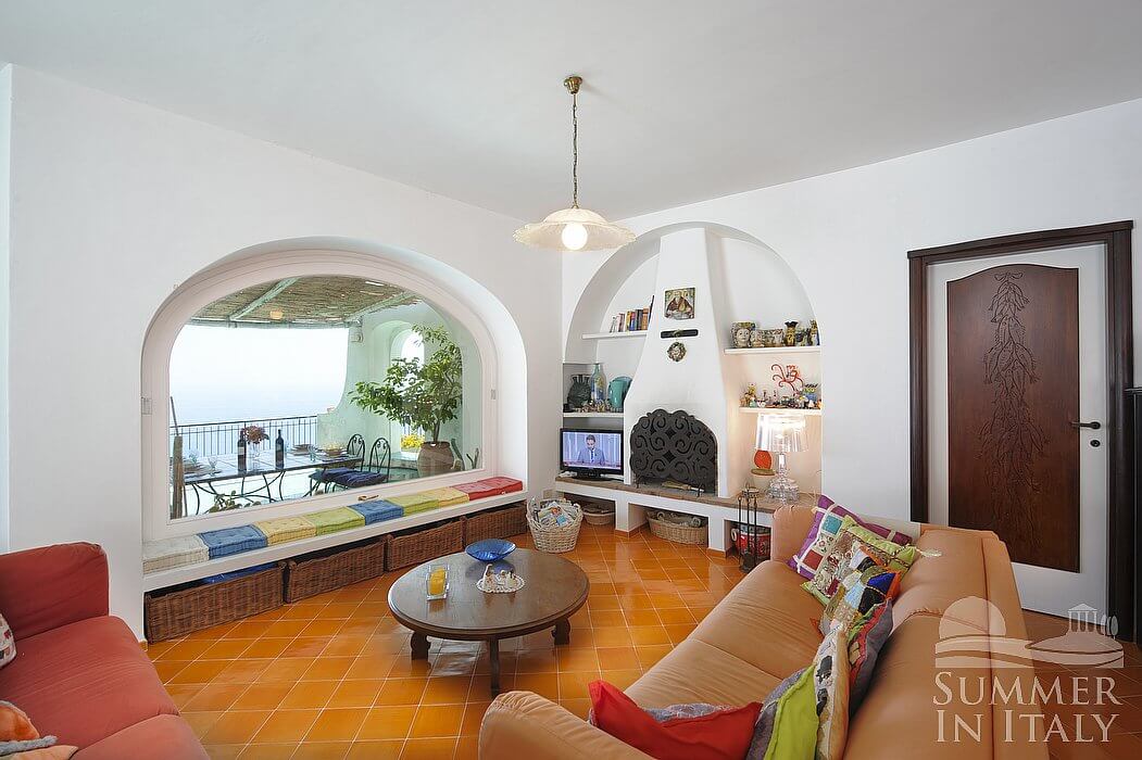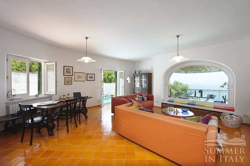 The second living room is paved with handmade majolica tiles. The furnishings are warm and welcoming. The furnishings include two sofas. In this room you will find an upright piano. There is a nice fireplace. The dining table can accommodate eight guests. In this room you will find a satellite television (local channels). From the living room you will be able to enter the terrace with a view of the sea and of the coastline through a French door. The room has a window. The room also has an arched window. It is equipped with an air conditioning/heating unit. Here you will also find a telephone.