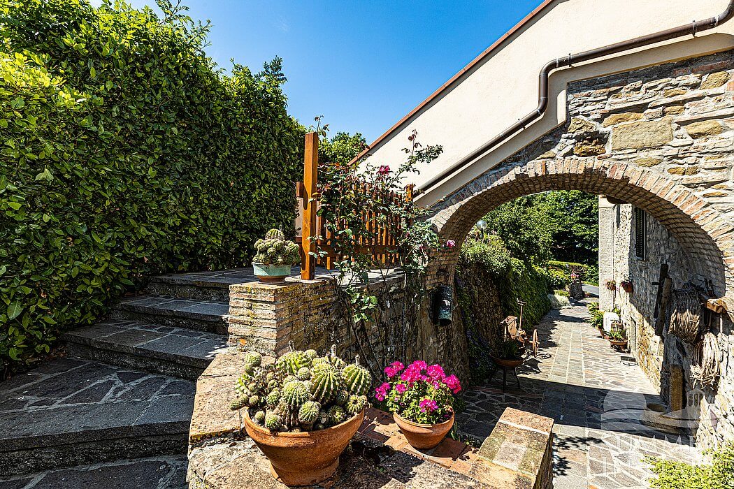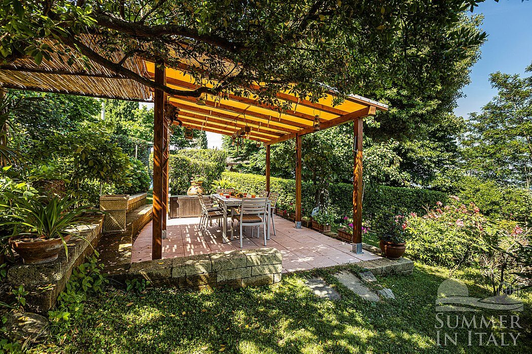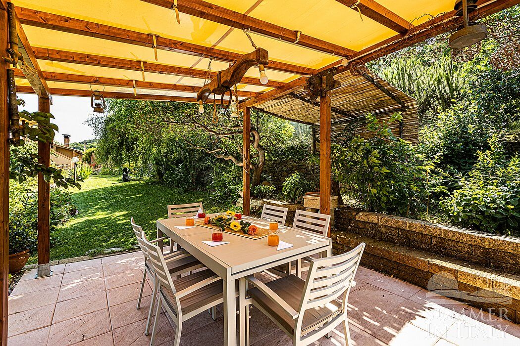 You will reach the garden from the parking area going up approximately eight stairway steps. The garden is 1000 square meters (10800 square feet) large. It is partly shaded by a characteristic roof and by tall trees. The garden is equipped with a wood bench, as well as with a table and chairs. From the garden you will enjoy a charming view of the greenery and of the swimming pool.