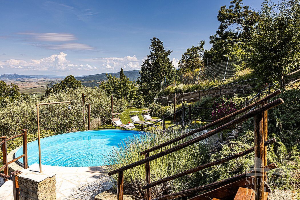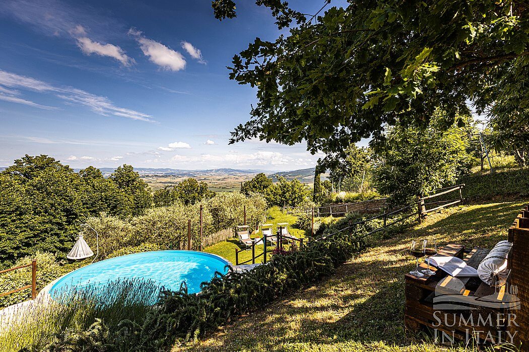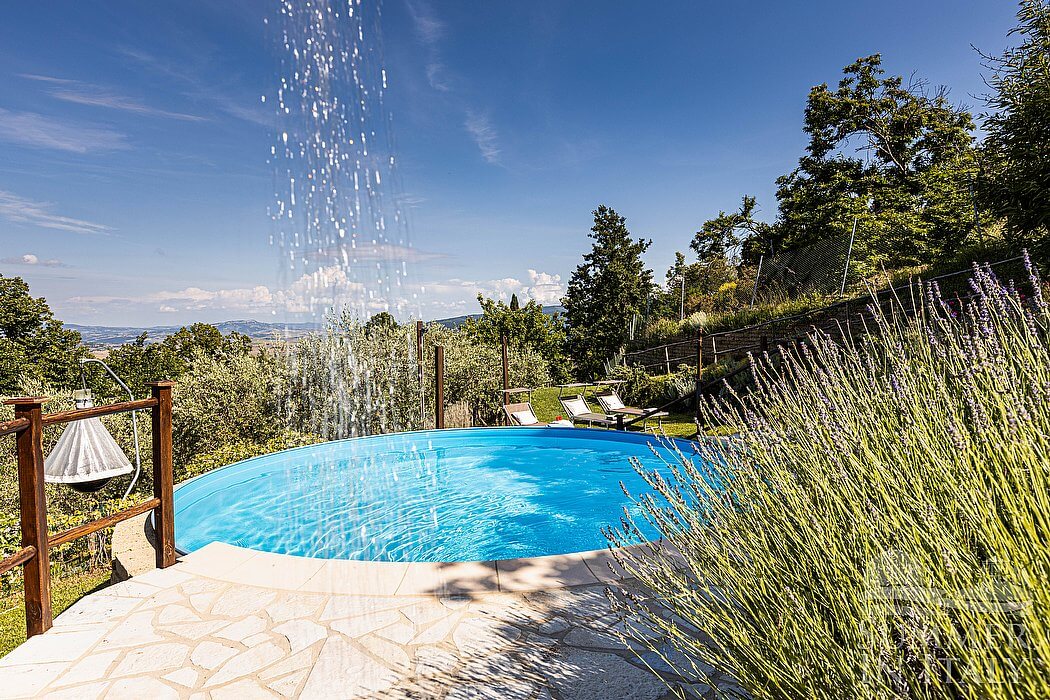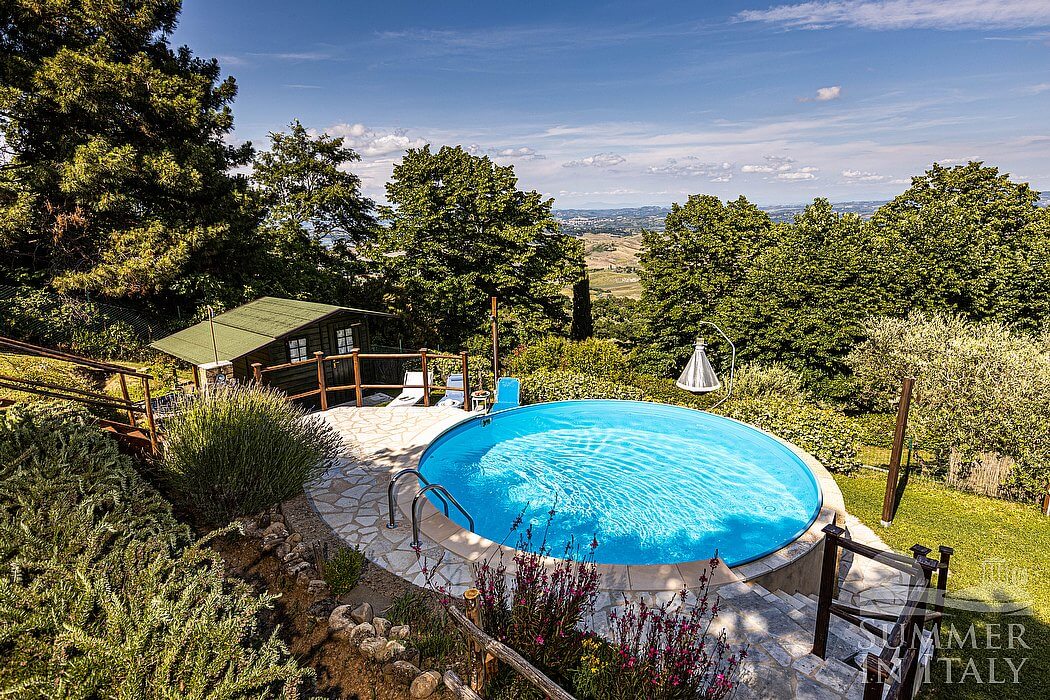 The above-ground swimming pool has a diameter of 5 meters (16 feet) and is deep 1.2 meter (4 feet). The area is equipped with sun loungers and an external shower. From the swimming pool you will enjoy a lovely view of the greenery and of the hills. The pool is open from the beginning of June until the end of September.