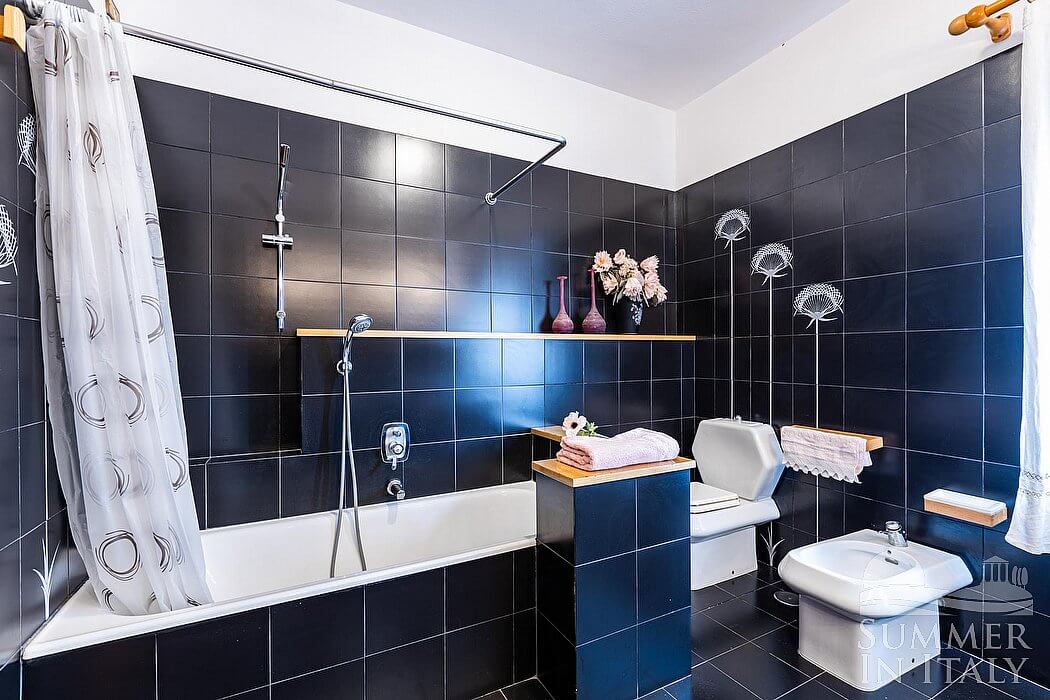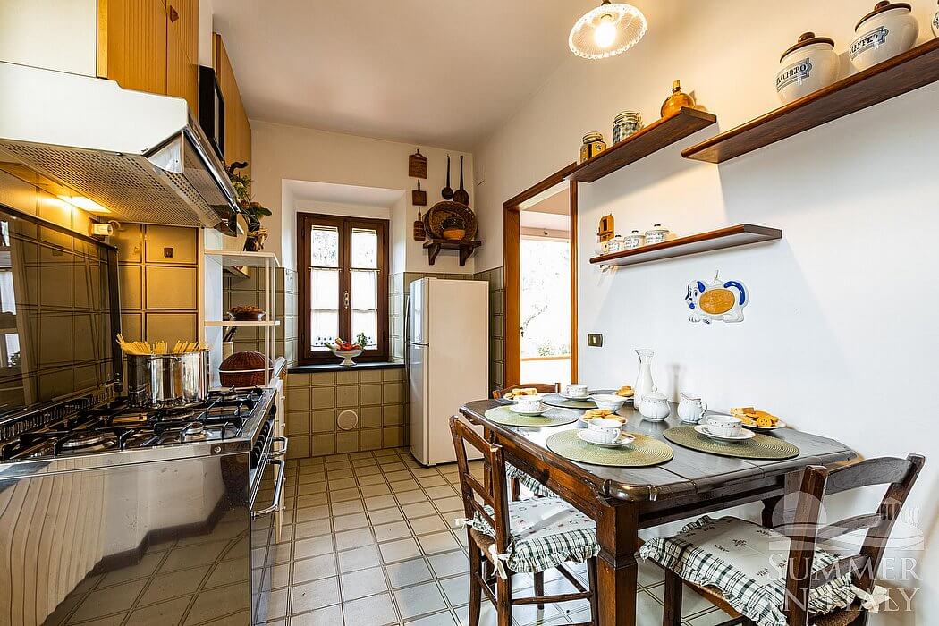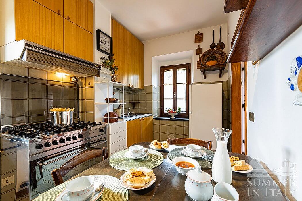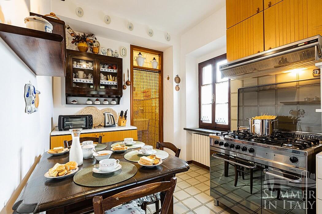 You will be able to enter the kitchen from the living room through a cased opening. It is professional-grade, equipped with a six-burner gas cooker, an electric oven, a refrigerator with freezer, a dishwasher, a microwave oven, an Italian-style coffee-maker, an American-style coffee-maker (bring your filters!) and a kettle. The dining table can accommodate three guests. The kitchen has two windows.