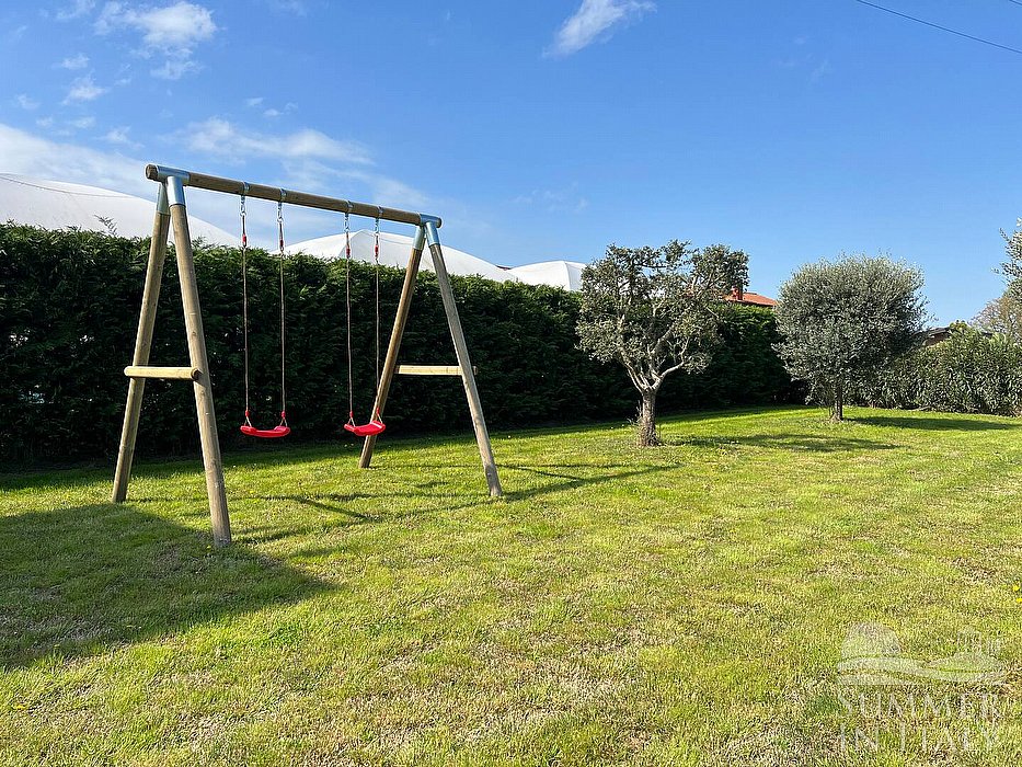 The swimming pool is 6 meters (20 feet) large by 12 meters (39 feet) long, 1.5 meters (5 feet) deep. The area is equipped with a table, chairs, a sun umbrella, sun loungers, a gazebo and an external shower. This area is also equipped with a small sofa. From the swimming pool you will have a view of the garden. The pool is open from the beginning of April until mid-October.