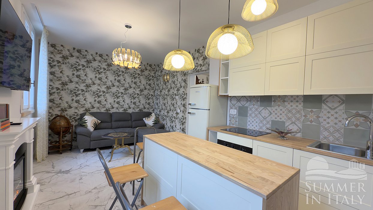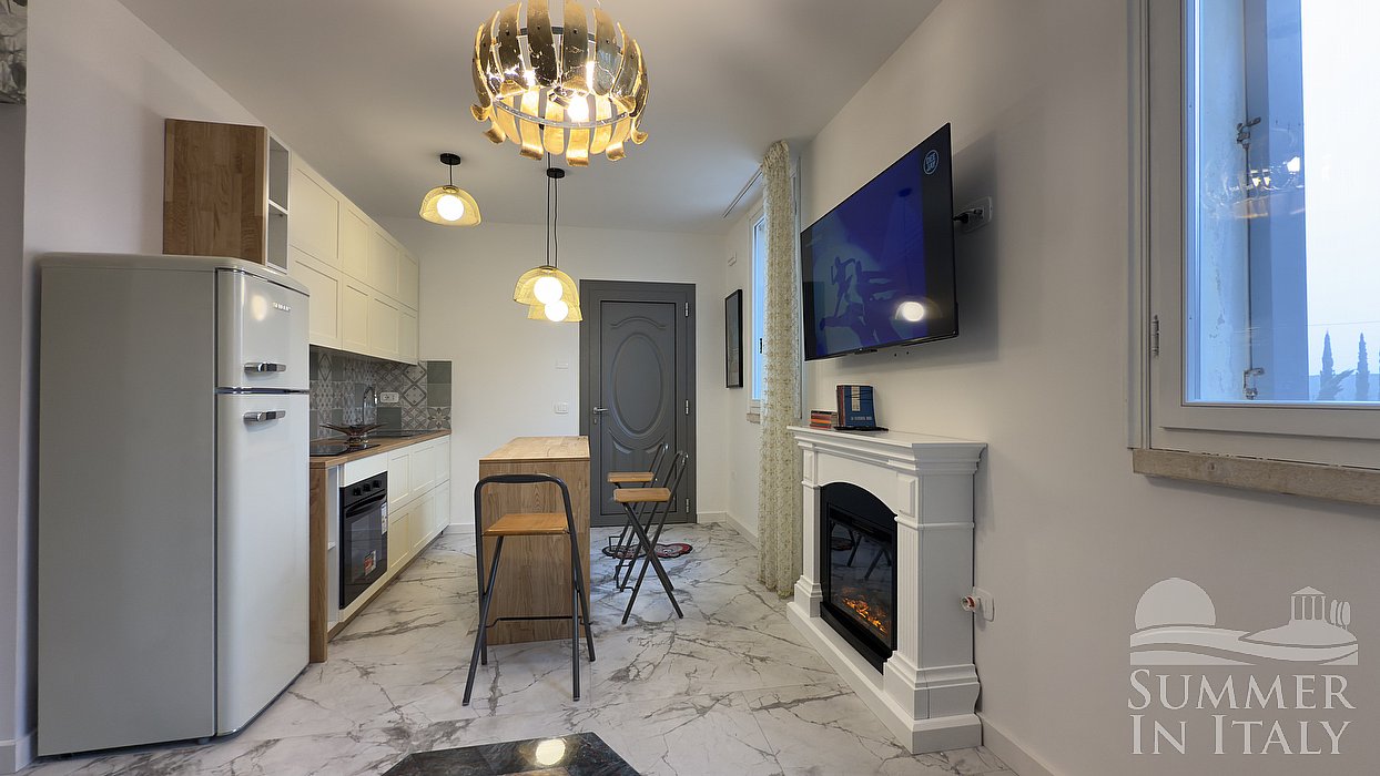 You will be able to enter the kitchen from the independent entrance or from a corridor. It is equipped with a four-burner induction cooker, an electric oven, a refrigerator with freezer, a dishwasher, a microwave oven, an Italian-style coffee-maker, an American-style coffee-maker and a kettle. The dining table can accommodate four guests. The furnishings of the kitchen include a divan bed for one guest. The kitchen is also equipped with a smart TV. The kitchen has two windows, and is equipped with an air conditioning/heating unit.