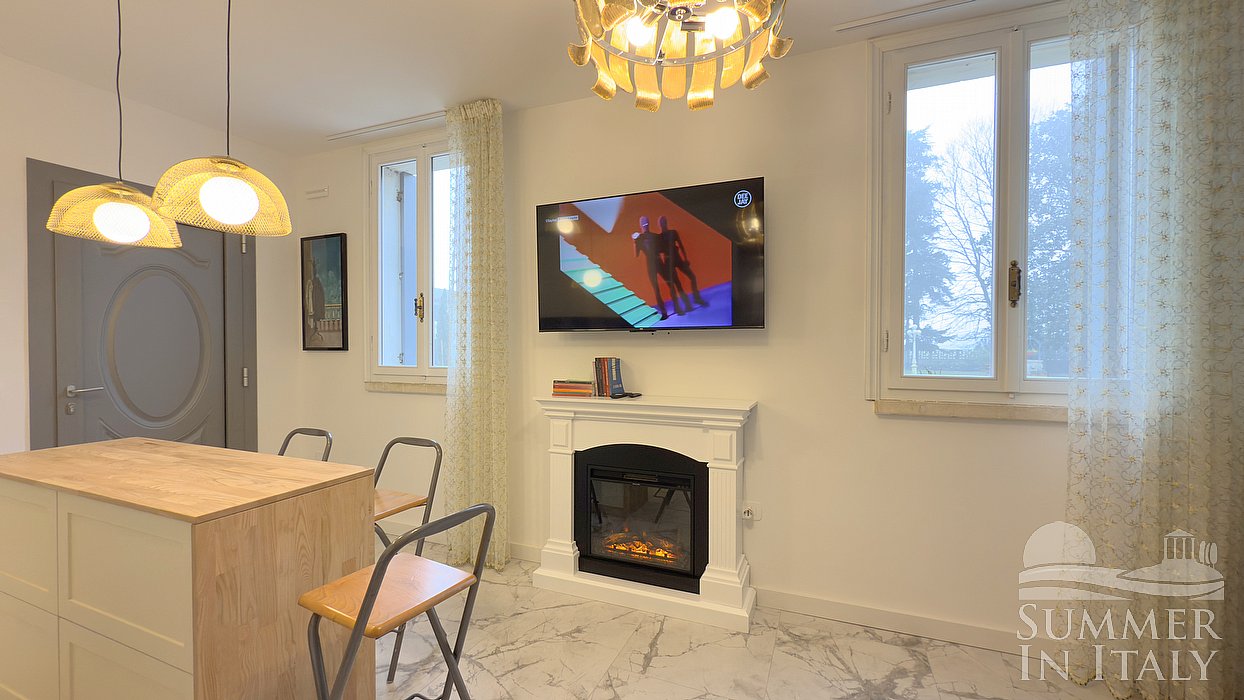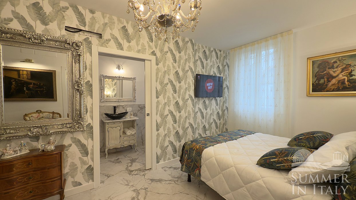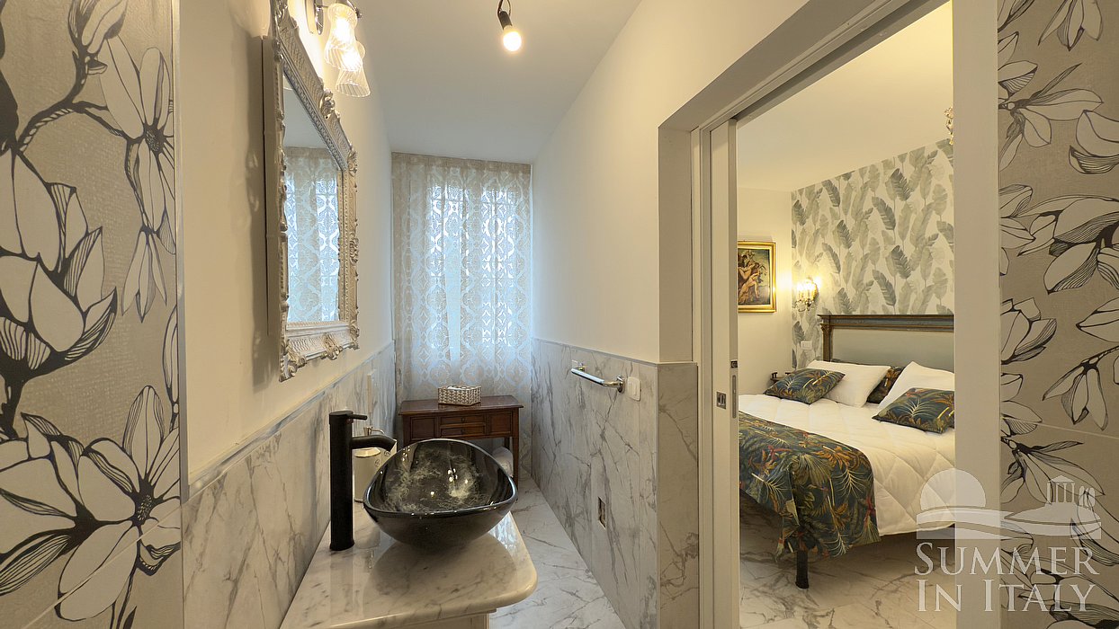 You will be able to enter the fourth bedroom through a corridor. The bedroom has a matrimonial bed (160 cm/63 inches, wider than a queen-size bed) and a French bed (120 cm/47 inches). The furnishings include two armchairs and a desk. In this room you will find a smart TV. The room has two windows, and it's equipped with an air conditioning/heating unit. This bedroom has an en-suite bathroom, made of marble and equipped with a washbasin, a toilet, a fully enclosed shower and a hairdryer. The bathroom is open-plan.