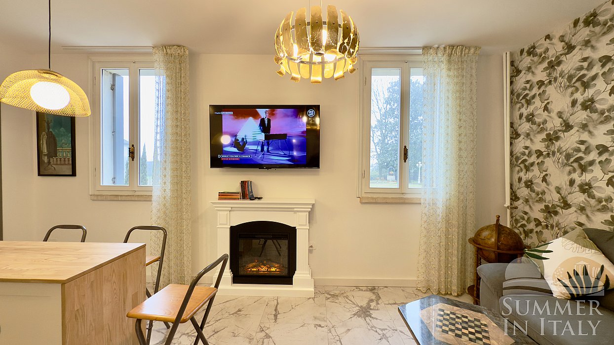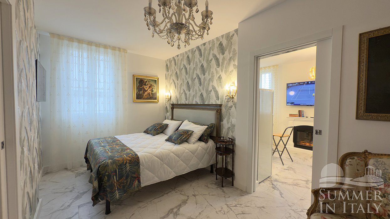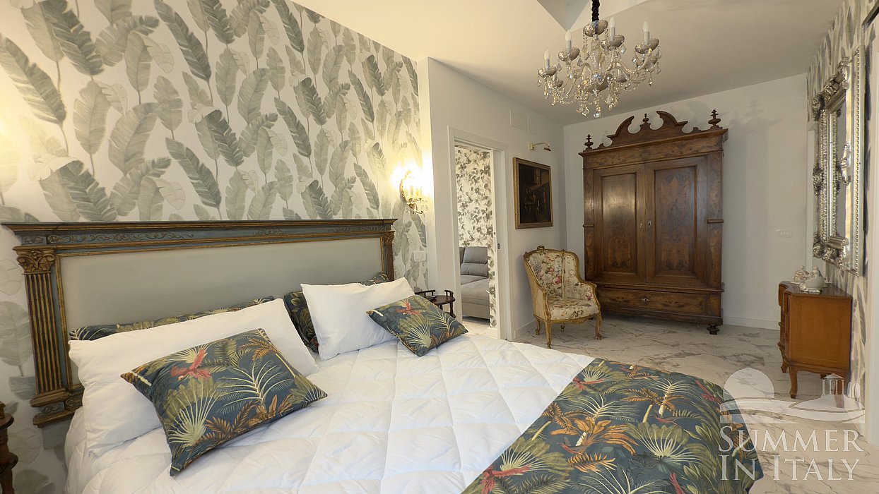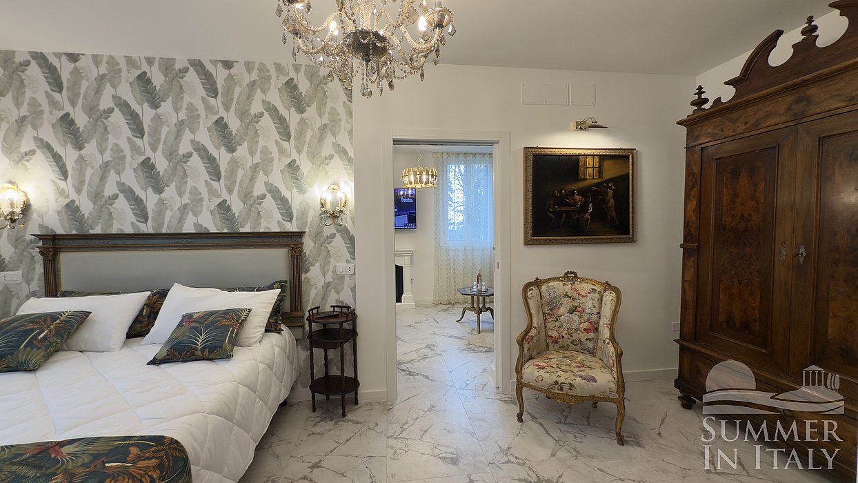 This suite is made up by three interconnected rooms: a sleeping area, a sitting area and a bathroom. You will be able to enter the fifth bedroom through a corridor. The bedroom has a king-size bed (180 cm/71 inches). An additional single bed (80 cm/32 inches) is available (if requested in advance) to make it a quadruple room. The furnishings include two armchairs and a divan bed for one guest. In this room you will find a smart TV. The room has two windows, and it's equipped with an air conditioning/heating unit. This bedroom has an en-suite bathroom, made of marble and equipped with a washbasin, a toilet, a fully enclosed shower and a hairdryer.