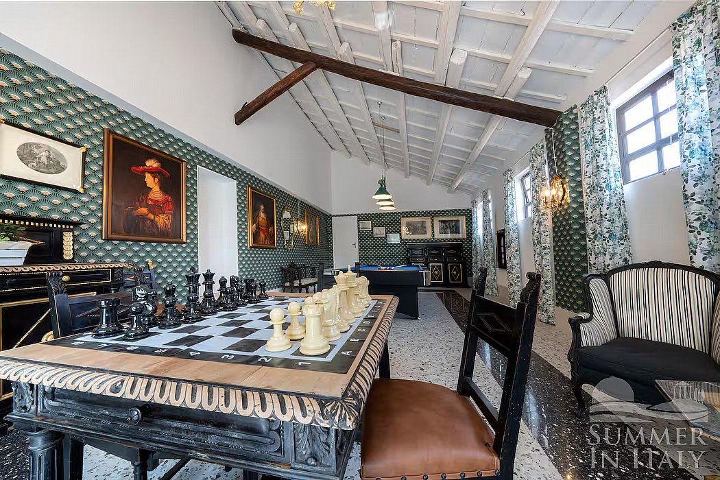 You will be able to enter the game room from a corridor going down three steps. The ceiling is sloped, is made of wood and has white exposed beams. Here you will be able to have fun with a pool table and a game table. The furnishings include two armchairs and an upholstered fabric bench. From the game room you will be able to enter the garden through a French door. The room also has four high windows. The room is equipped with an air conditioning/heating unit.