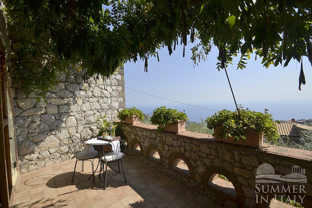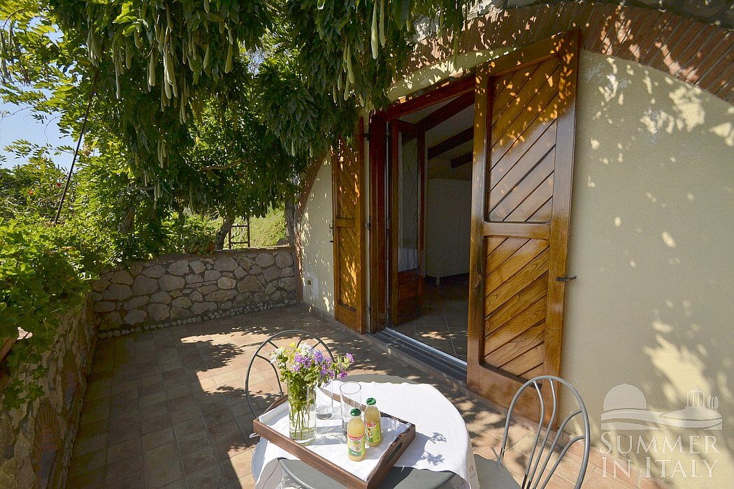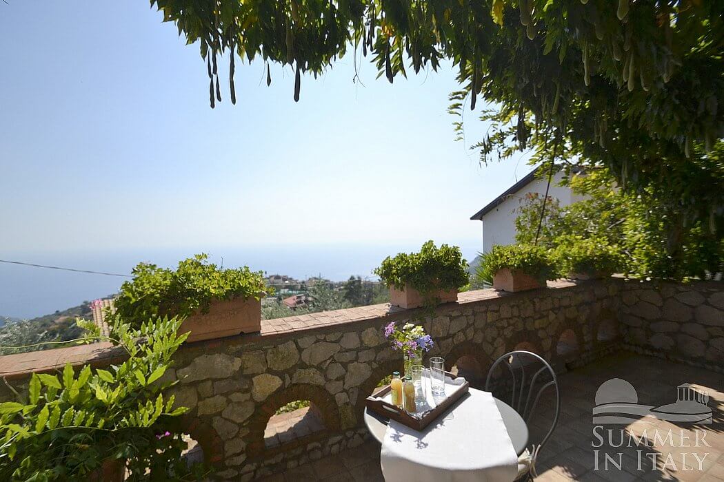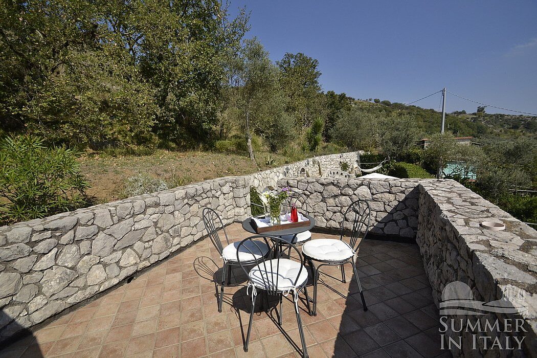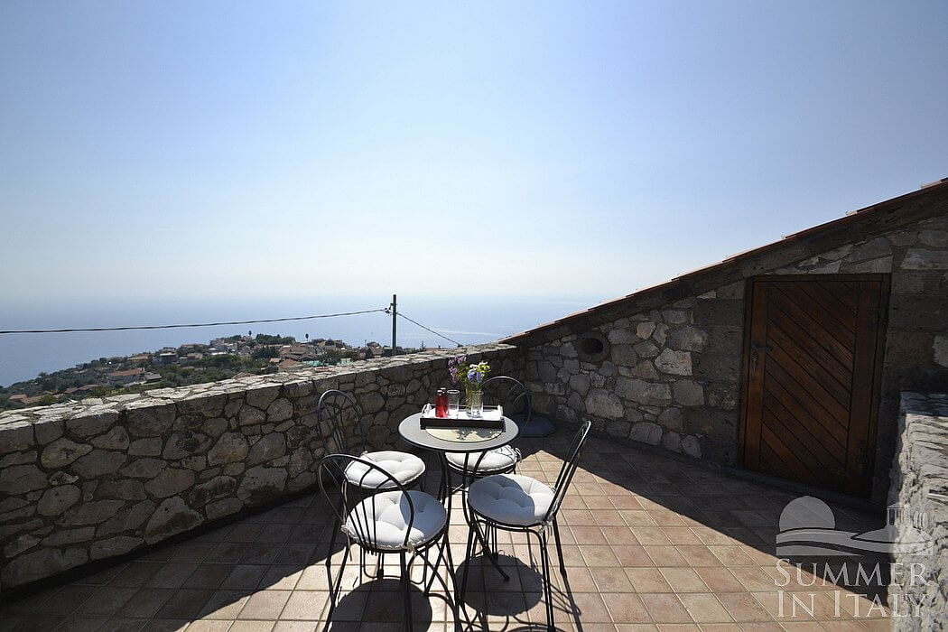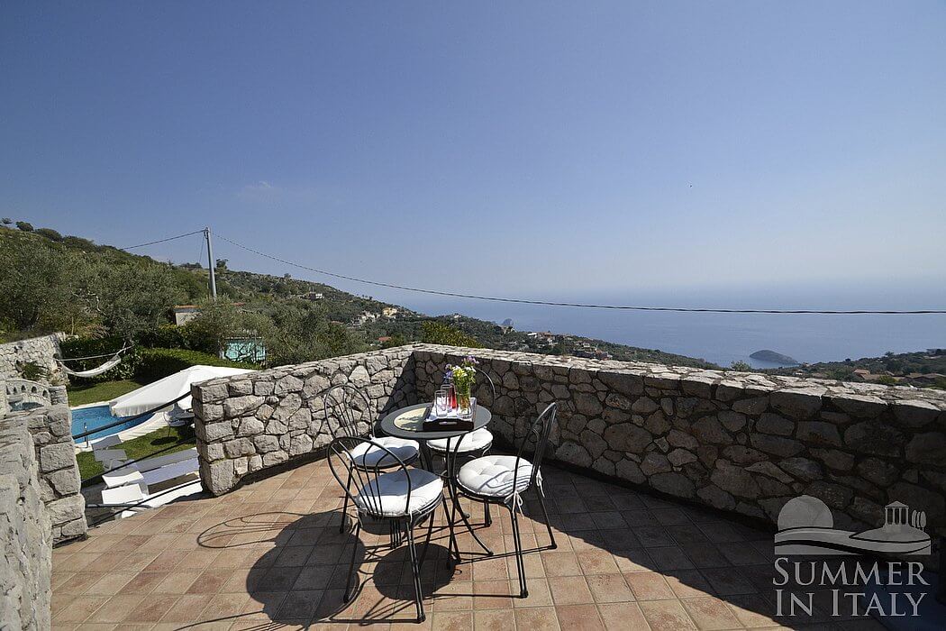 The terrace is 12 square meters (130 square feet) large. You will be able to enter it swimming pool area climbing 12 steps. It is equipped with a table and chairs. From the terrace you will enjoy a spectacular view of the sea.