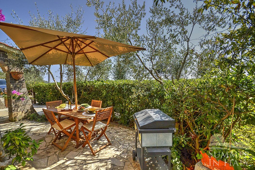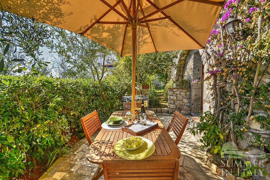 The patio is partly shaded by a porch made of stone. It is equipped with a table, chairs and a sun umbrella.