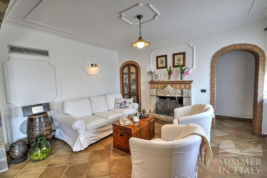 The furnishings of the living room are warm and elegant. The furnishings include two armchairs and a divan that unfolds into a double bed. There is a nice fireplace made of stone. The dining table can accommodate 12 guests. In this room you will find a television (local channels). From the living room you will be able to enter the patio through a French door. The room has an arched window with a view of the sea and of the coastline. It is equipped with an air conditioning/heating unit.