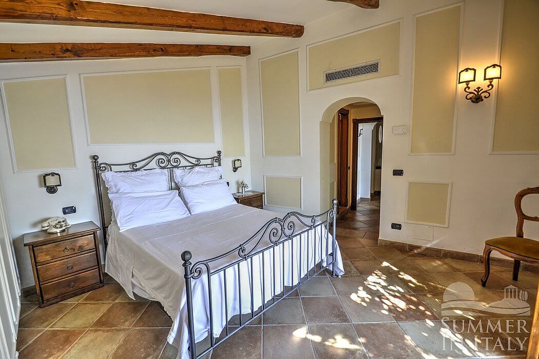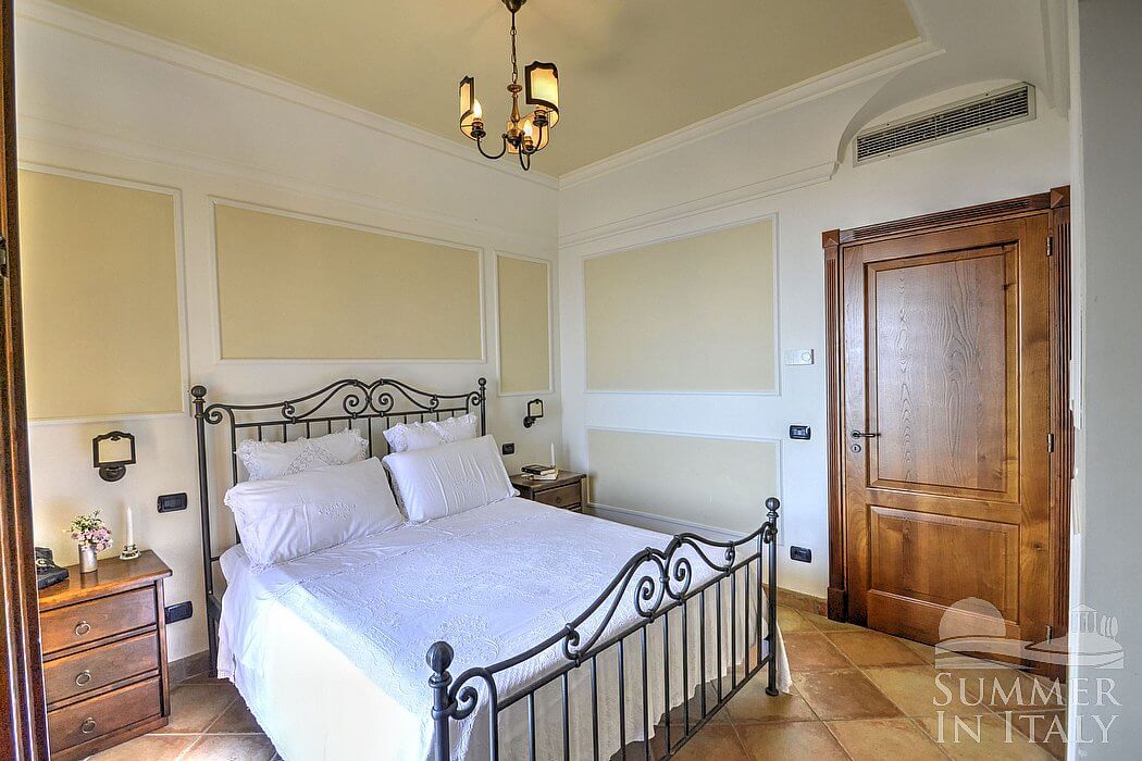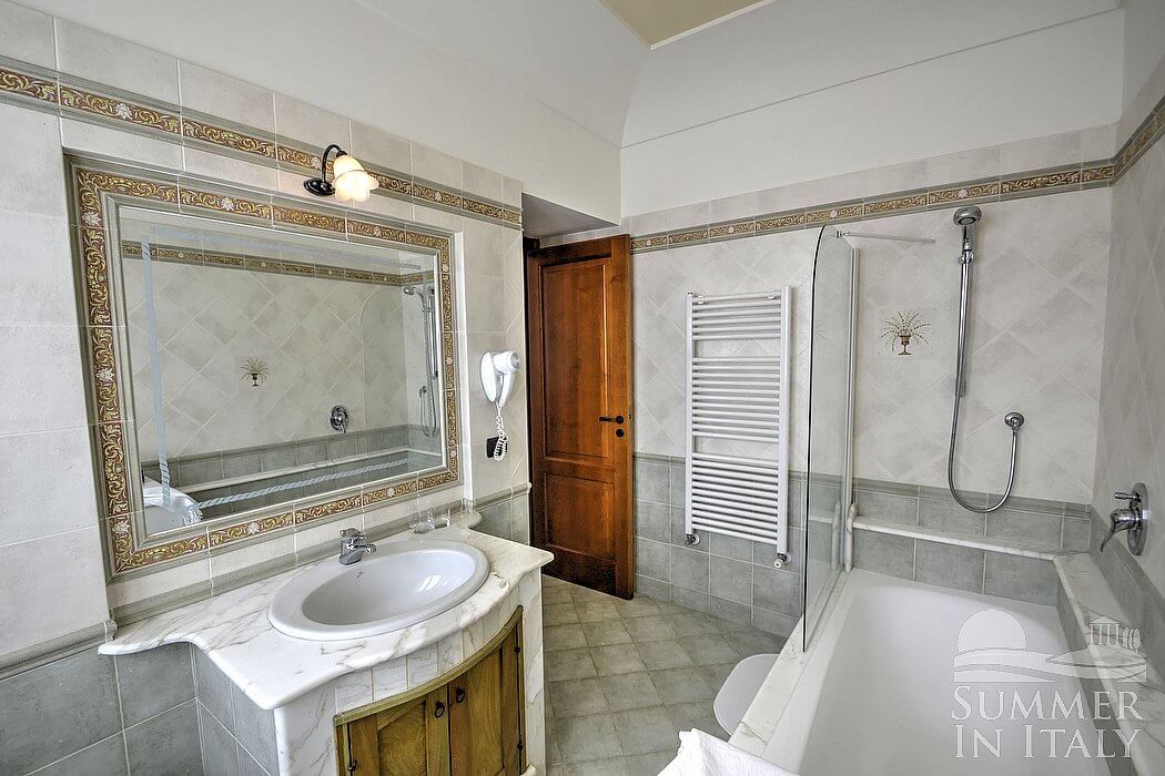 You will be able to enter the first bedroom from the corridor. The furnishings are elegant and welcoming. The room has a matrimonial bed (160 cm/62 inches, wider than a queen-size bed). From the bedroom you will be able to enter a terrace with a view of the sea and of the coastline through a French door. The bedroom is equipped with an air conditioning/heating unit. This bedroom has an en-suite bathroom, spacious and equipped with a washbasin, a toilet, a bathtub with fixed shower head and a hairdryer.