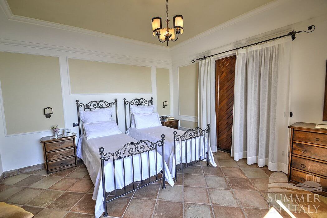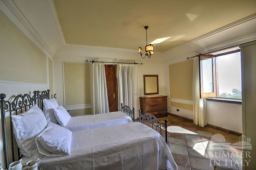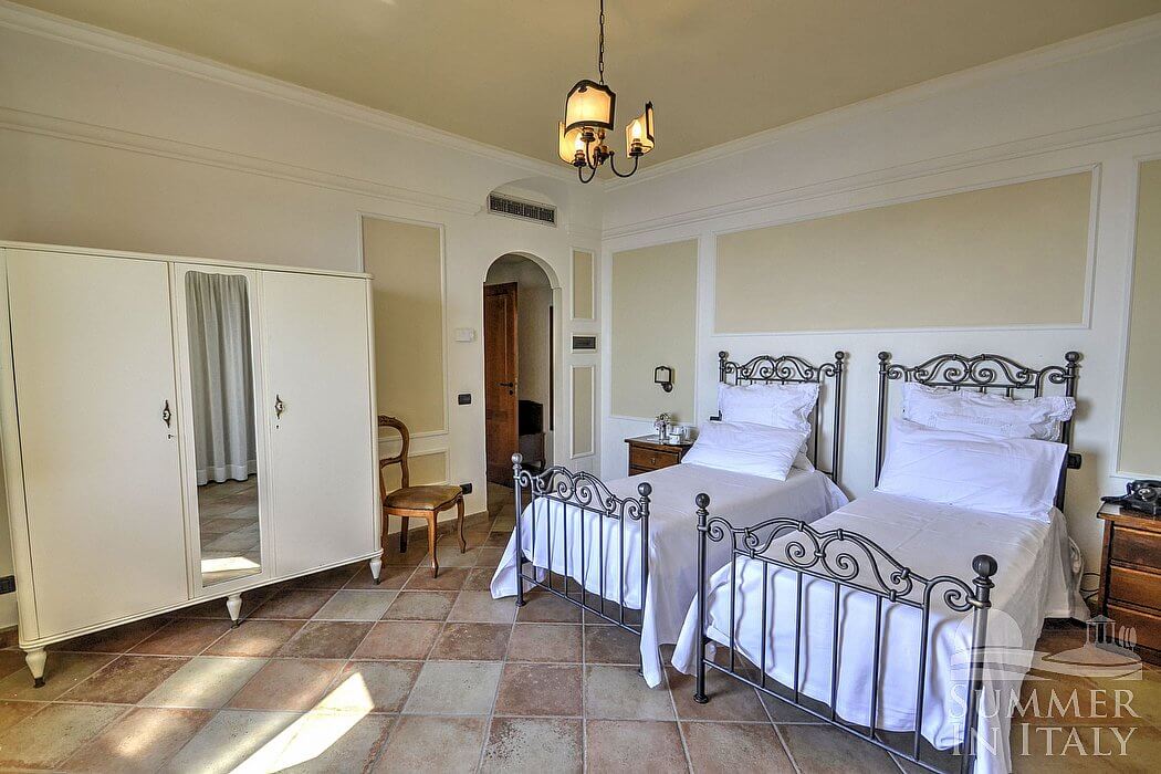 You will be able to enter the third bedroom from the corridor. It has two twin beds (80 cm/32 inches). An additional twin bed (80 cm/32 inches) is available (if requested in advance) to make it a triple room. From the bedroom you will be able to enter the garden and the swimming pool through a French door. The room has a window with a view of the sea. The bedroom is equipped with an air conditioning/heating unit. This bedroom has an en-suite bathroom, spacious and equipped with a washbasin, a toilet, a bathtub with fixed shower head and a hairdryer.
