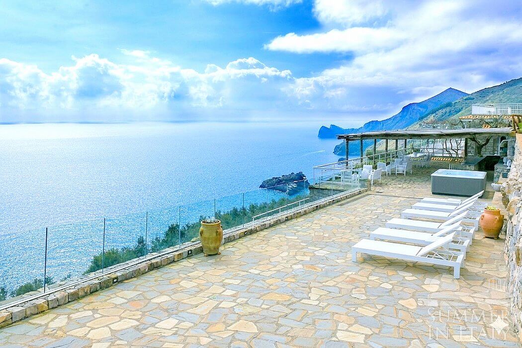 Villa La Lantana is a bright and sunny two-story villa built sheer above the sea. It sleeps eight people. From Villa La Lantana you will enjoy a fascinating view of the sea and of the coastline. Villa La Lantana is 150 square meters (1615 square feet). It features a private jacuzzi pool, a private terrace, two private patios, air conditioning (please read description below to check in which rooms the units are installed) and WI-FI Internet access.