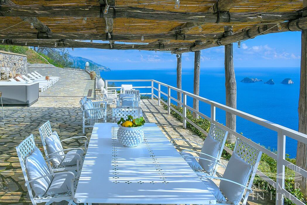 The terrace is 42 square meters (450 square feet) large. It is partly shaded by a bougainvillea pergola. It is equipped with a table and chairs. From the terrace you will enjoy a gorgeous view of the sea and of the small Li Galli islands.