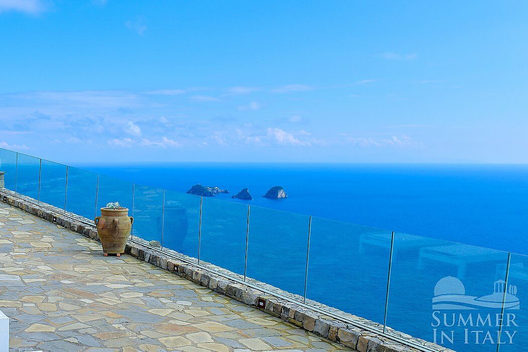 The first patio is 100 square meters (1076 square feet) large. It features an above-ground heated jacuzzi pool with hydromassage (2 by 2 meters, 6.5 by 6.5 feet) with four seats. The jacuzzi pool is open all year round. It is partly shaded by a characteristic pergola with a bamboo roof. It is equipped with small sofas and armchairs and with a table and chairs. Here you will also find a brickwork barbecue and a wood-fired pizza oven. From the patio you will enjoy a fascinating view of the sea and of the small Li Galli islands.